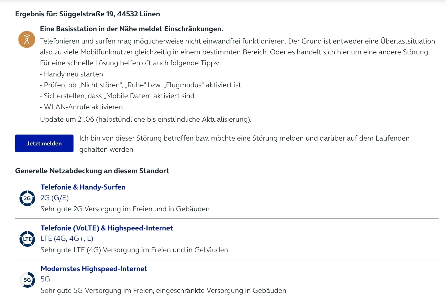 Wenn ich dort die Adresse vom Standort eingebe, erscheint dort die Meldung: “Eine Basisstation in der Nähe meldet Einschränkungen.”