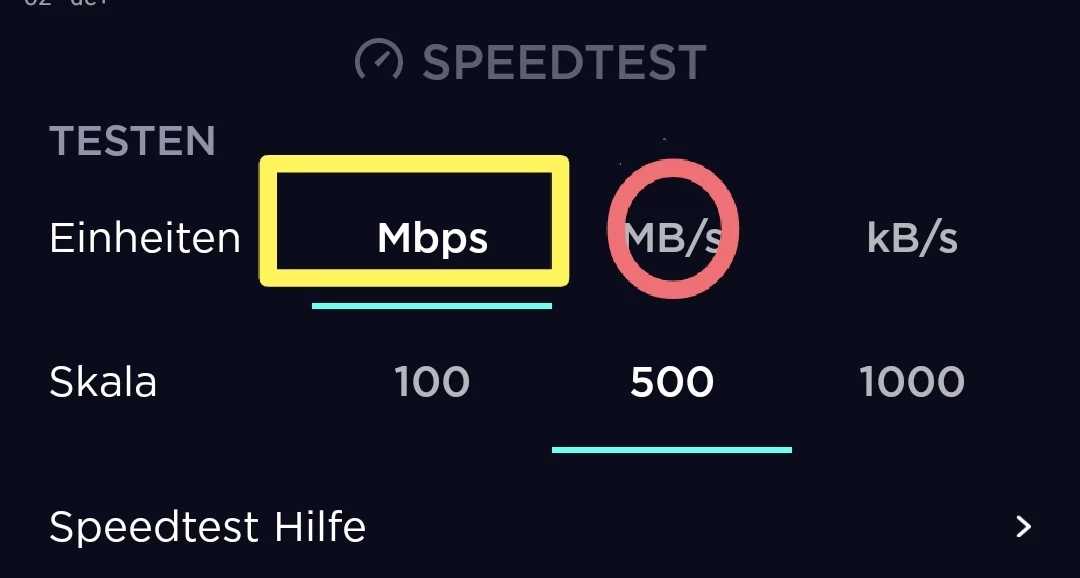 Die gelb markierte Angabe ist die richtige, um die Geschwindigkeit in Mbit/s anzuzeigen.