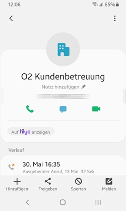 So sieht das z.B. bei der Kundenbetreuung von O2 aus. Die Telefonnummer ist nicht in meinen Kontakten hinterlegt!