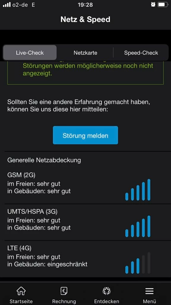 Laut Live-Check liegt tatsächlich eine Störung an einem Masten vor. Wenn ich die Entstörungs-SMS abonniere, dann erhalte ich jedes Mal nach weniger als einem Tag den Hinweis, die Störung sei behoben. Ist sie aber nicht. Habe weiterhin nur 2G und auch das Telefonieren funktioniert nicht problemlos. Habe öfters Störungen dabei.
