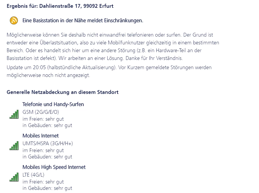 Ich lebe in Erfurt, dort habe ich in meinem Wohnbereich, im LTE Netz eine gemessene Geschwindigkeit von 1-2 Mbit sowohl draußen als auch drinnen.