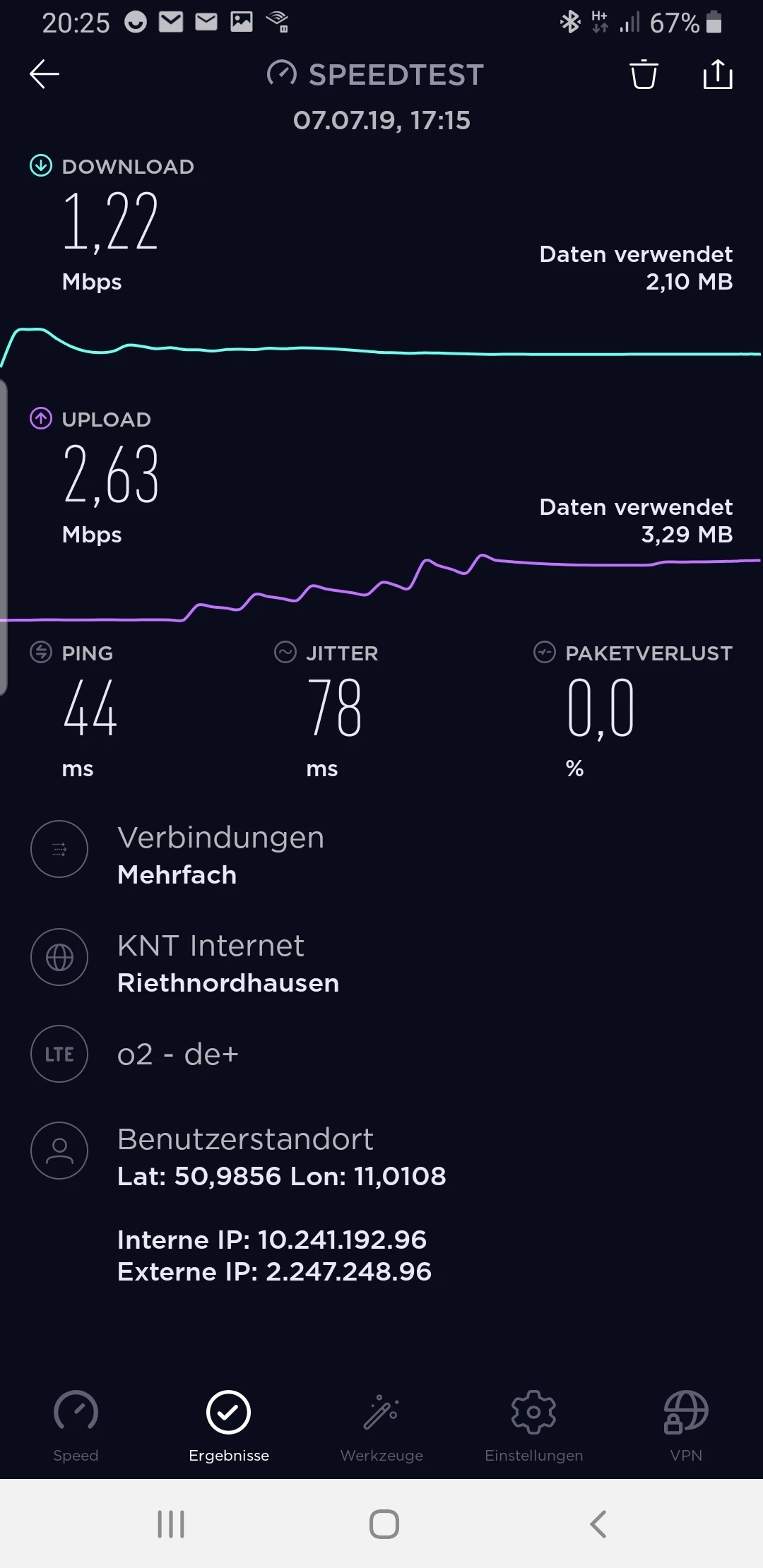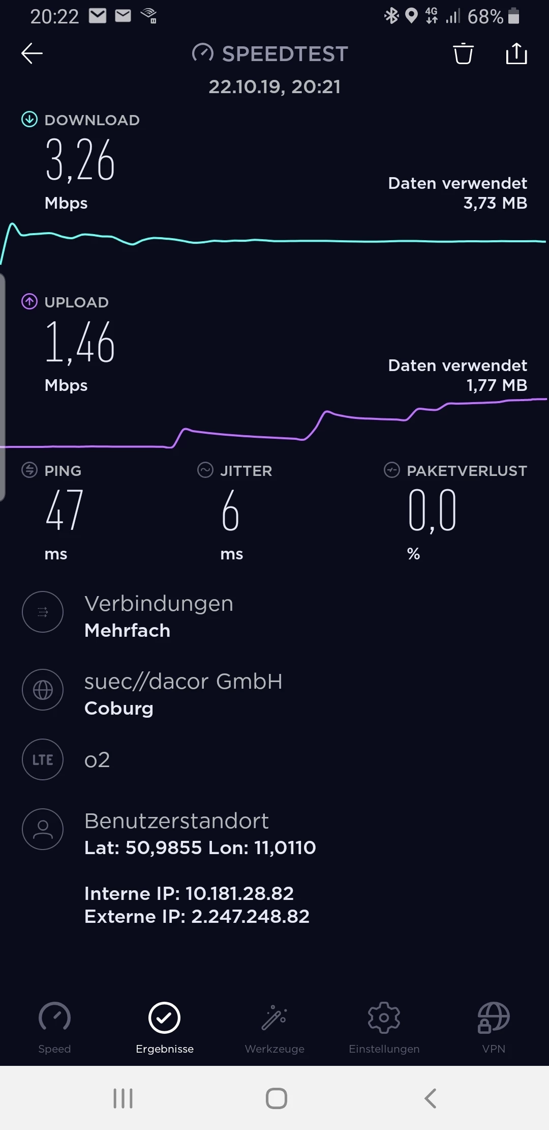 Ich habe einmal die GPS Koordinaten aus deinem Speedtest genommen. Für diesen Standort ist eine Störung gemeldet und auch wird vor einer Überlastung gewarnt. Es könnte die Messwerte bestätigen. Du kannst es auch selber hier sehen: https://www.o2online.de/service/netz-verfuegbarkeit/netzstoerung/