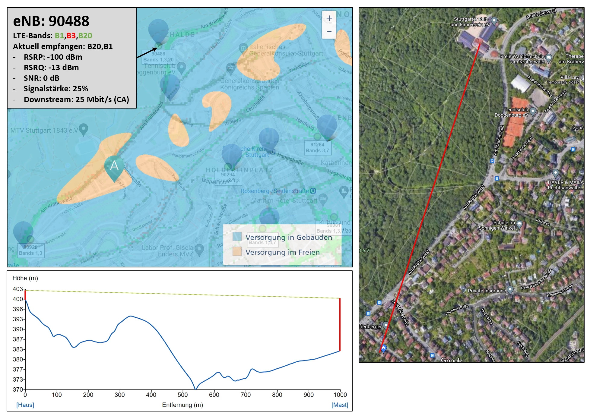 Aktuell verfügbarer Sendemast: eNB 90488 mit ca. 25 MBit/s im Downstream bei CA von B1, B20 (Bildquelle: Google Maps)