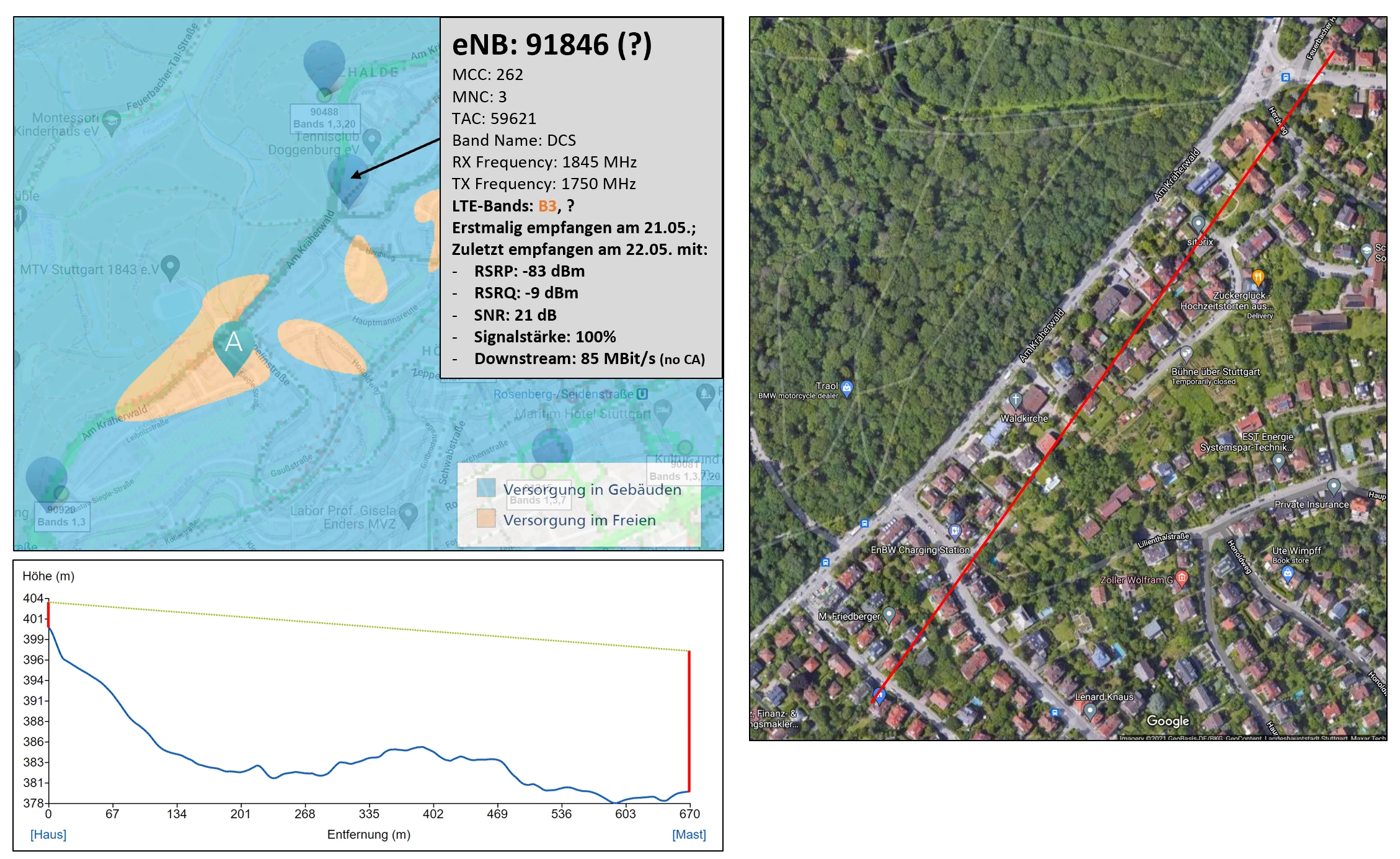 Die eNB war dabei auf meinem Handy mit 91846 angegeben. Zu meinem Erstaunen ist diese eNB Seiten wie Cellmapper & Co. jedoch (noch) nicht bekannt. Der Empfangsrichtung nach vermute ich, dass es sich dabei um einen bisher für GSM aktiven Sendemasten (eventuell BTS ID 9046, gem. Cellmapper?) handelt.