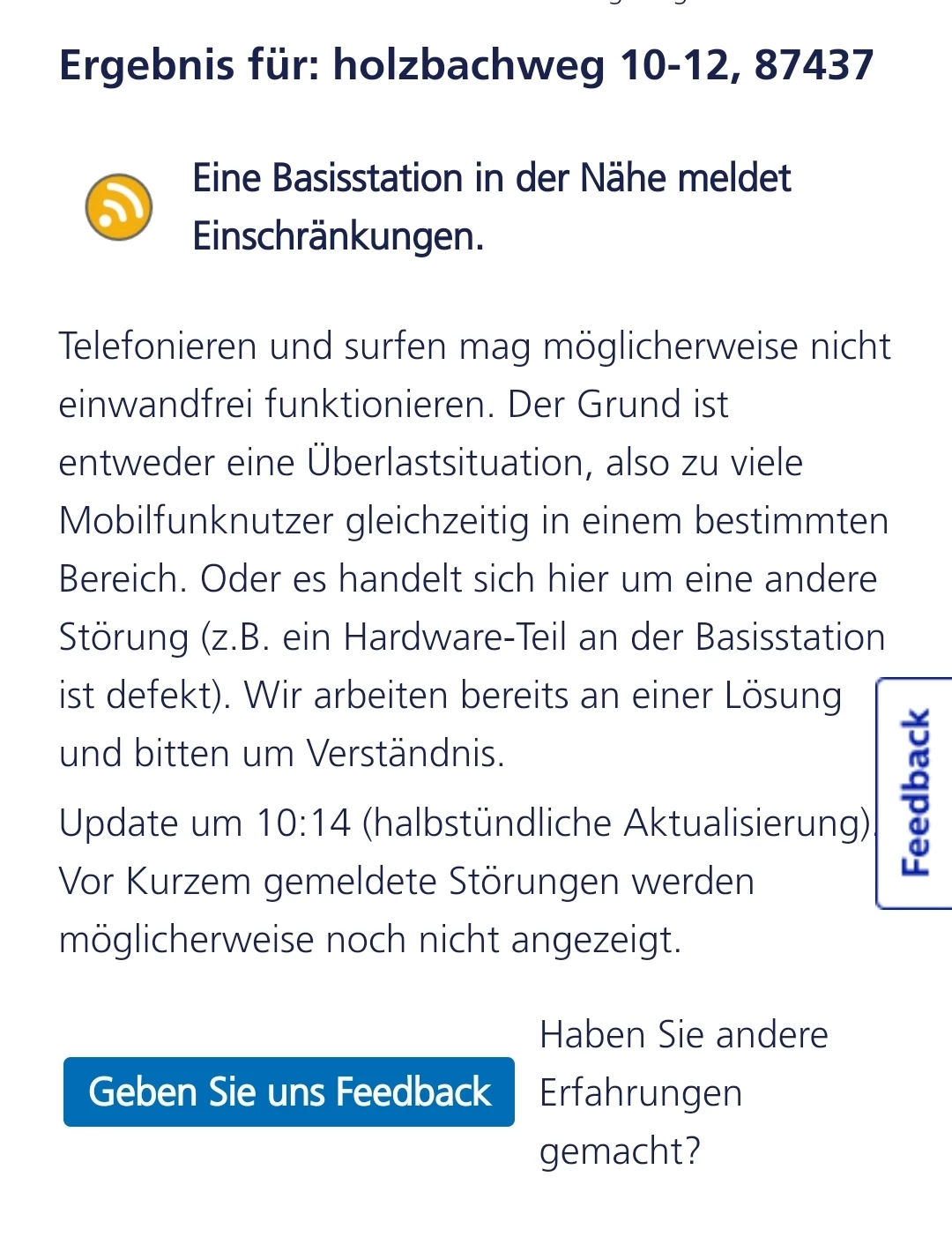 Telefonieren und surfen mag möglicherweise nicht einwandfrei funktionieren. Der Grund ist entweder eine Überlastsituation, also zu viele Mobilfunknutzer gleichzeitig in einem bestimmten Bereich. Oder es handelt sich hier um eine andere Störung (z.B. ein Hardware-Teil an der Basisstation ist defekt). Wir arbeiten bereits an einer Lösung und bitten um Verständnis.