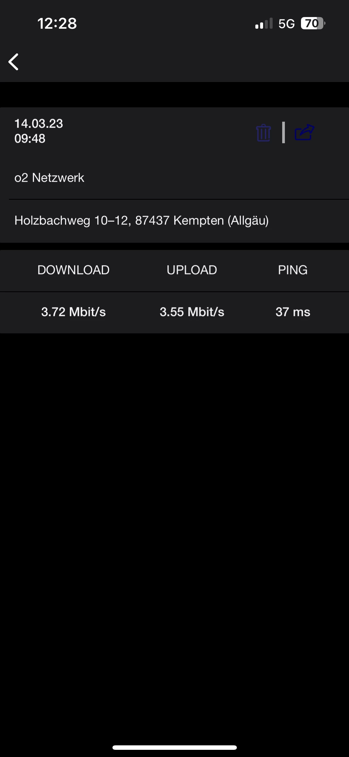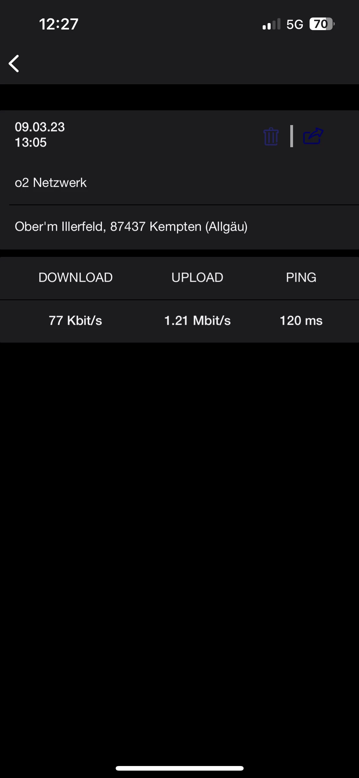Auf meiner Arbeit habe ich vollen 5G Empfang, aber nur eine Downloadrate von weniger als 3 Mbit, teilweise unter 800 Kbit.