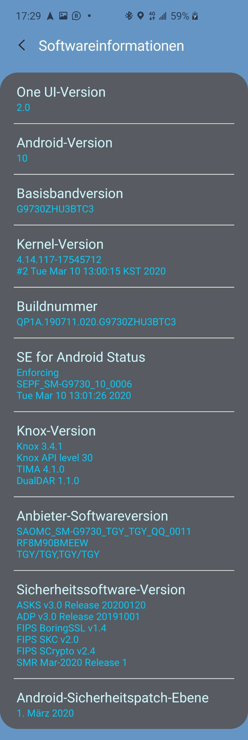 Also in deinen Fall würde ich zusätzlich auch mal ein Firmwareupdate durchführen, denn es gibt mittlerweile Android 10 für dein Smartphone, und die Sicherheitspatchebene wäre dann auf Stand März 2020.