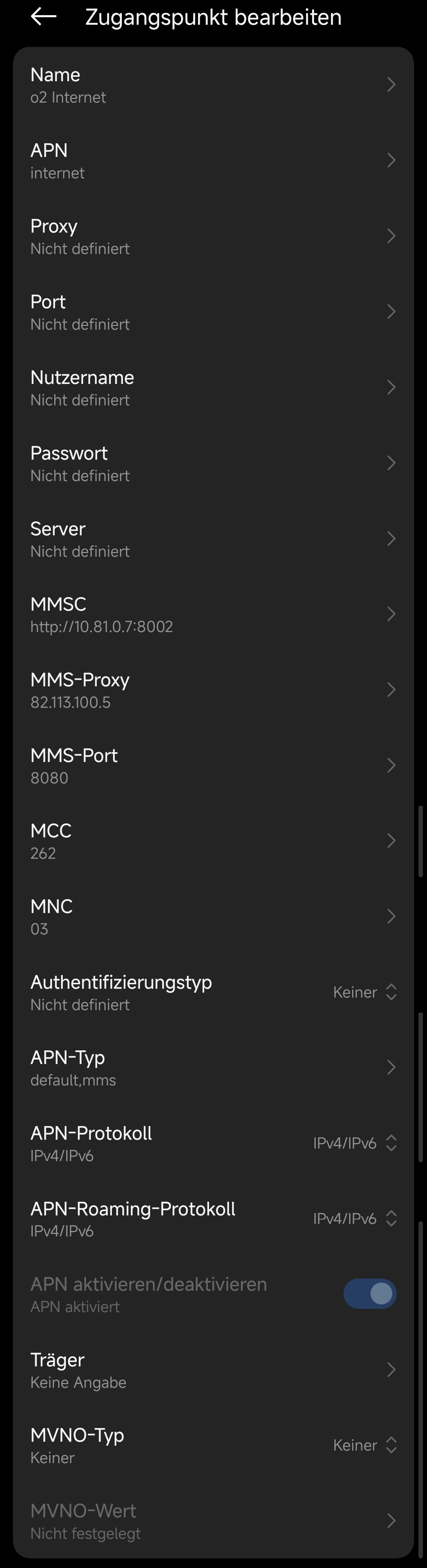 Hier meine APN-Einstellungen. Vielleicht hat sich dort ein Fehler eingeschlichen (habe nichts bearbeitet, nur alle Daten sichtbar gemacht)