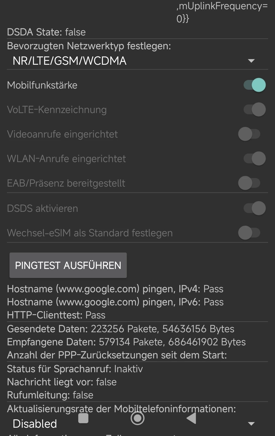 Dementsprechend habe ich einen Netzscan durchgeführt und mein Telefon ist wirklich nicht mit dem SA verbunden, sondern 5G NSA. VoNR kann ich im Moment also nicht ausprobieren.