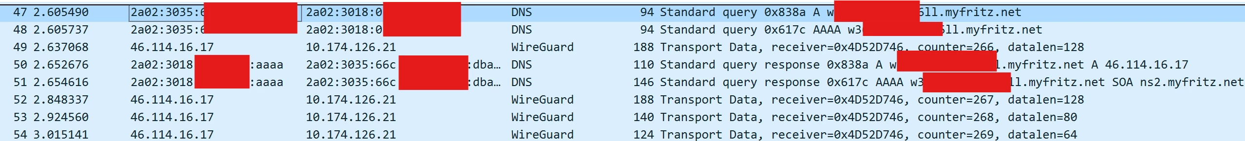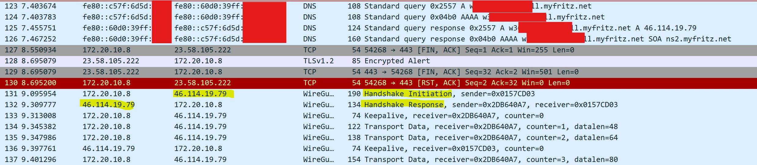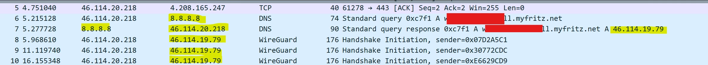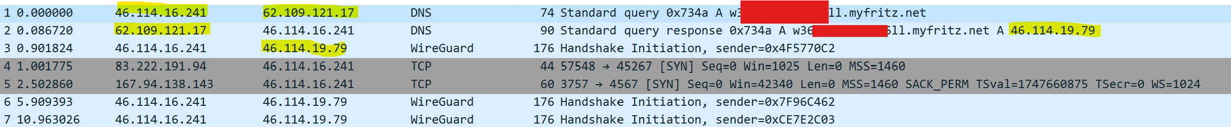 Hier sieht man wie ich von dem O2 DNS die IP Adresse von der Datenkarte bekomme und wie im unterenteil versucht wird der Handshake durchzuführen, der wiederholt sich alle 5 Sec bekommt aber keine Antwort.