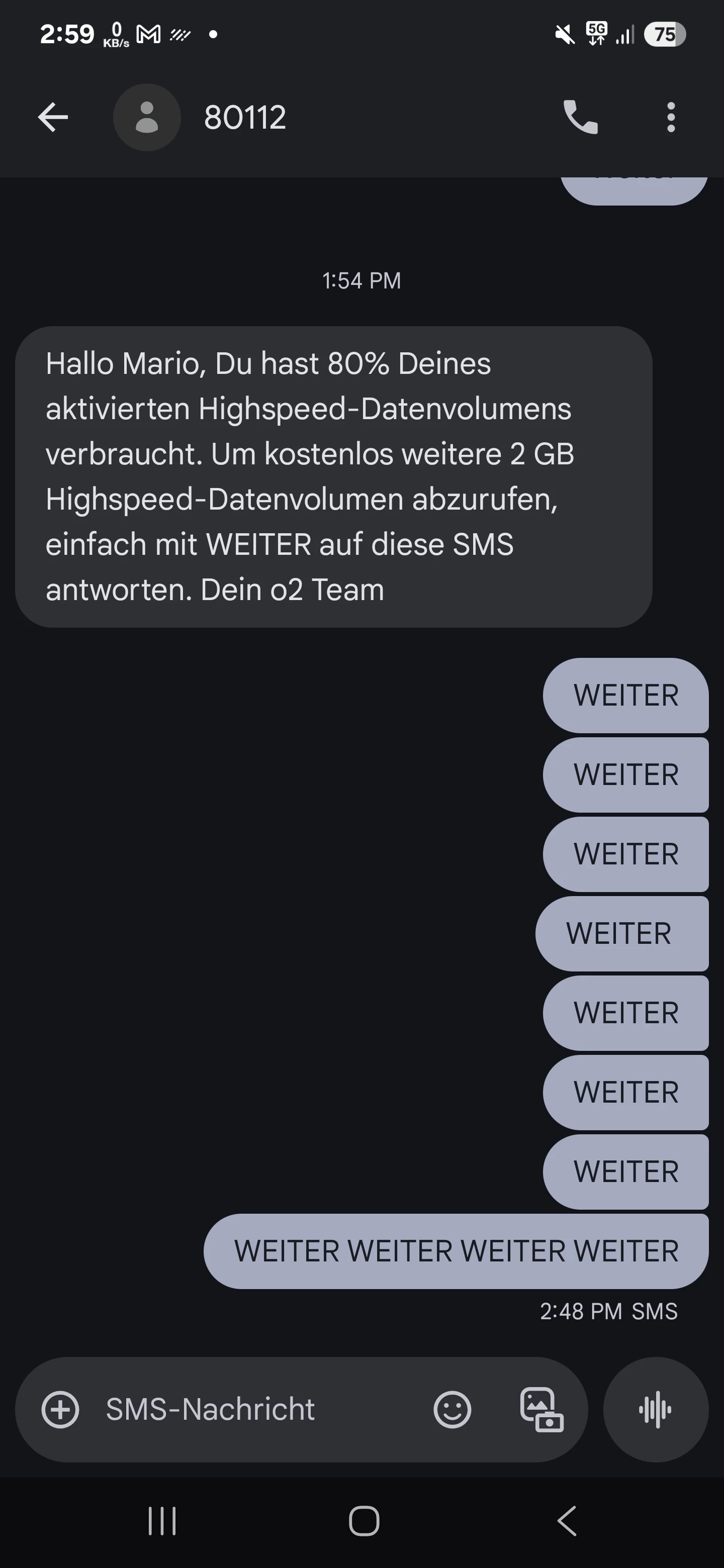 Ich hab den Mobilfunvertrag, der unbegrenzt 10 GB täglich enthält mit der Möglichkeit vom Abrufen von zusätzlichen Datenvolumina. Ich schicke an die 80112 das Wort WEITER, aber ich kriege kein zusätzliches Datenvolumen. Wieso?