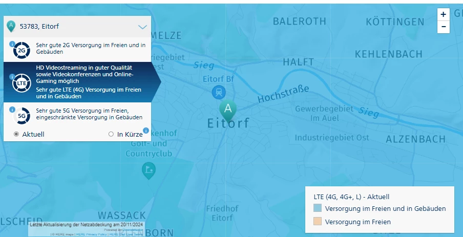 In 53783 Eitorf ist unser 5G laut unserer Netzabdeckungskarte für den Bereich innerhalb von Gebäuden noch nicht ausreichend ausgebaut: