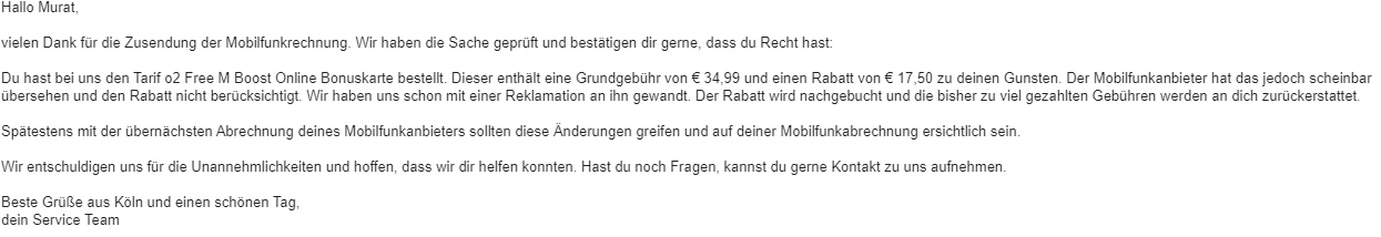 Das Problem hier war, dass mir eine Grundgebühr von 17,49€ angegeben wurde, die doppelte Summe aber seit Monaten abgebucht wird.