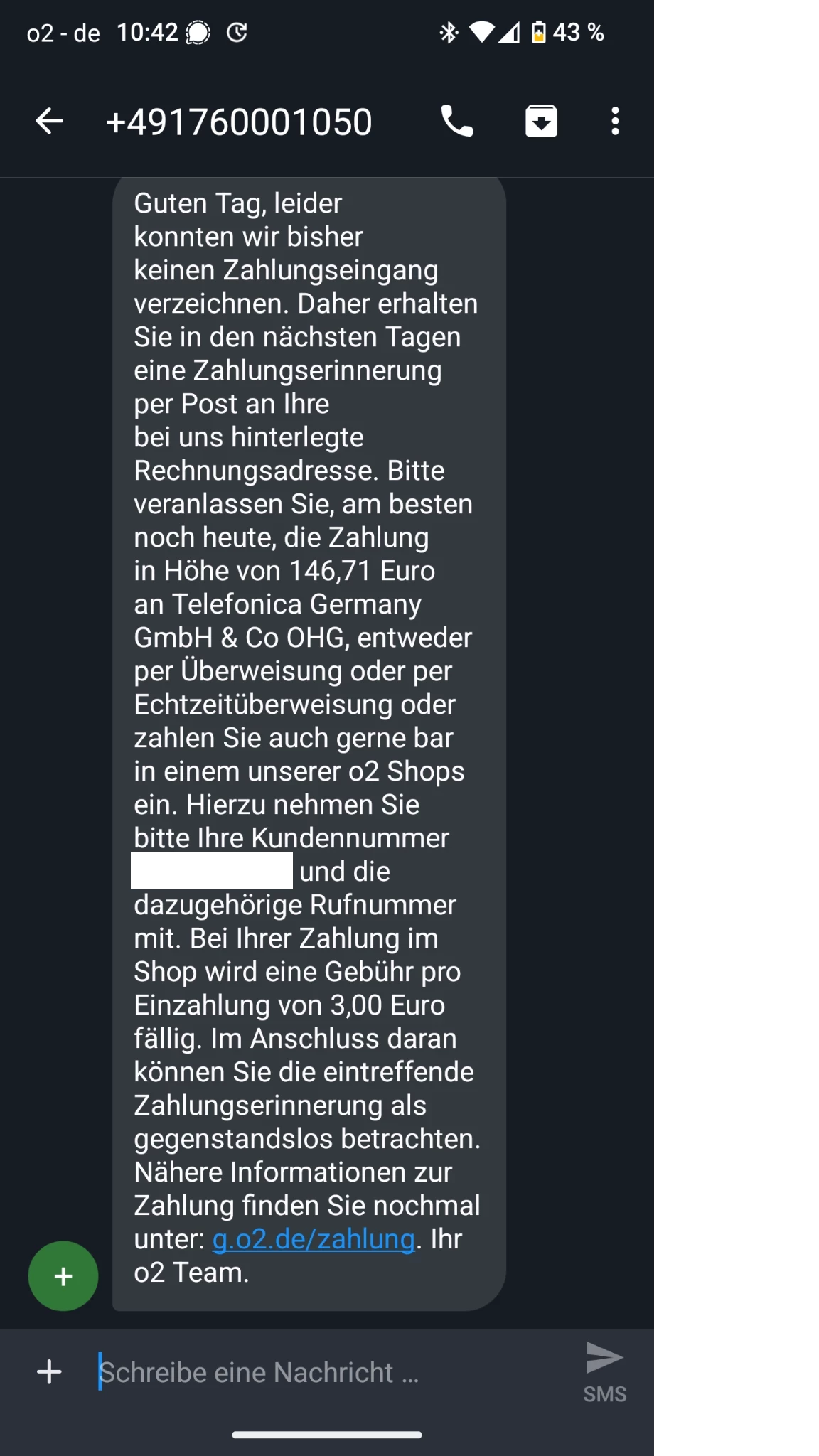 Aber: Heute SMS erhalten wegen „146,71 € offen" (vorher 141,70 € – woher die 5 €?) mit Forderung „sofort zahlen“. Habe per SMS geantwortet, dass Router nachweislich zurück sind + auf Telefonat verwiesen. Natürlich weiterhin unkommentiert.