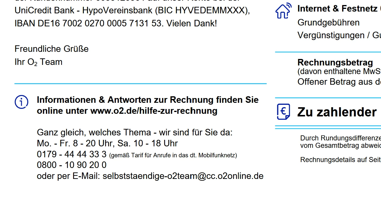 (Im Übrigen wundert es mich, dass das Email-Postfach selbststaendige-o2team@cc.o2online.de offenbar nicht betreut wird. Dieses Anliegen habe ich direkt nach der Rechnungsstellung dort erfolglos am 12.JAN adressiert. Existiert dieses Postfach überhaupt noch?)
