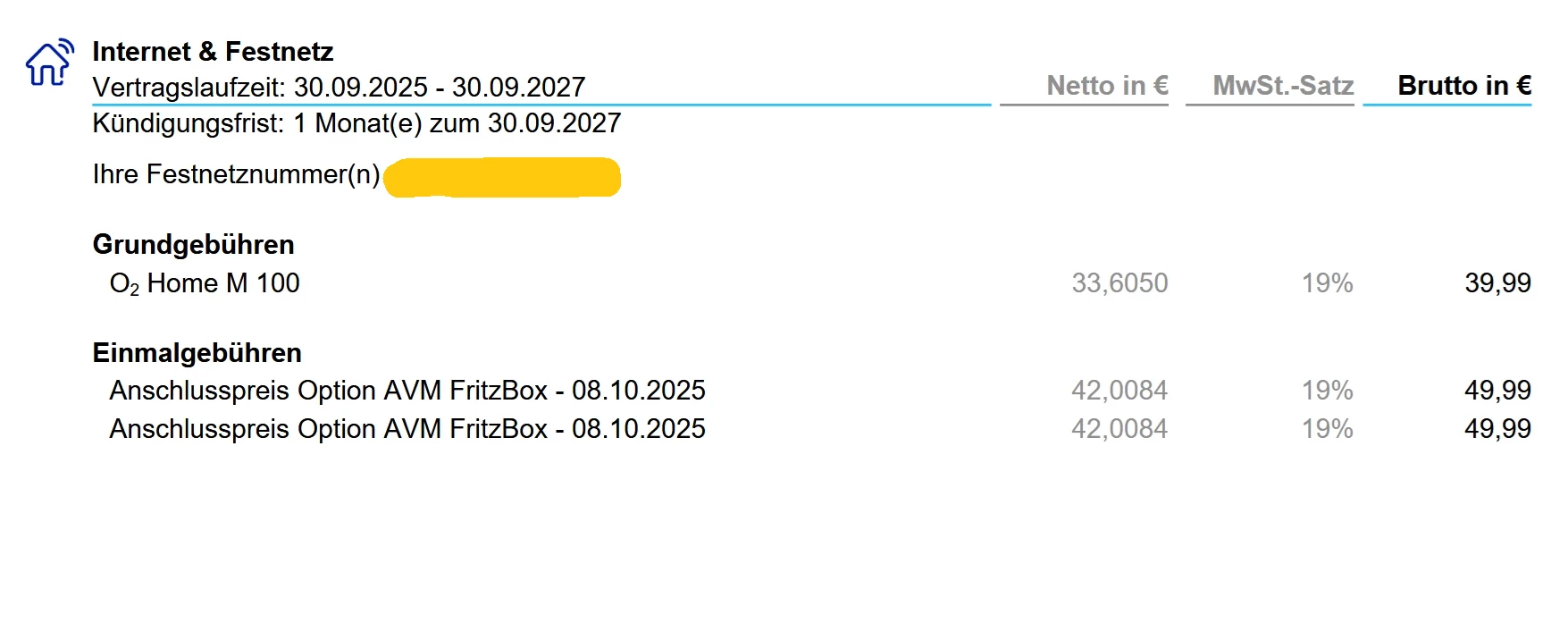 Ich bin im Oktober 2025 umgezogen (kostenlos, weil mit Vertragsverlängerung) und mir wurde nach Upgrade auf eine 100er Leitung am 08.10.2025 ein kostenloser Austauschrouter per Telefon angeboten (bulgarisches Callcenter). Nachdem die Bestätigung über den Austausch per Email kam, habe ich den Austauschrouter widerrufen, denn dort stand auf einmal eine Gebühr von 49,99€ drin - sogar 2 Mal. Ich nutze also lieber die alte FritzBox weiter. Der Widerruf fand per Email statt, den mir ein Kollege Namens Frank M. bestätigte. “Ich kann sehr gut nachvollziehen, dass die Situation für Sie ärgerlich ist. Laut unserem System ist der Austauschrouter kostenpflichtig. Es fallen eimalig 49,99 € für die AVM FRITZ!Box 7590 für die Bereitstellung an. Gerne habe ich Ihren Widerruf umgehend an unsere Logistik weitergeleitet. Da wir nicht sicherstellen können, ob der Versand noch gestoppt werden kann, haben Sie selbstverständlich die Möglichkeit, die Annahme der Lieferung direkt bei DHL zu verweigern. In diesem Fall wird der Router automatisch an uns zurückgesendet und es entstehen für Sie keine Kosten.” In der darauffolgenden Rechnung allerdings wurde nun 2 Mal die Position “Anschlusspreis AVM FritzBox” abgerechnet. Mir wurde bestätigt, dass kein Router verschickt wurde und es wurde aber nur 1 Mal diese Position storniert. Die 2. Position mit dem gleichen Titel blieb, obwohl ich seitens des Chats die Bestätigung bekam, dass beide Positionen auch wieder storniert werden würden.