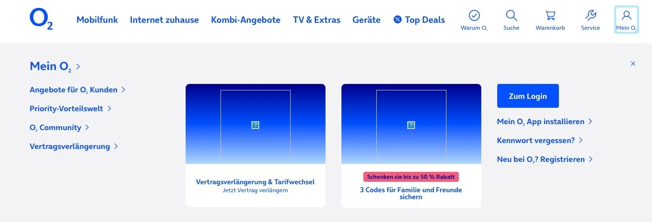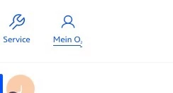 Wenn ich dann mit der Maus im Browser über “Mein O2” fahre, klappt nichts herunter, aber man sieht so einen winzigen blauen Strich etwas versetzt. Ich nehme an, dass hier ein Drop-Down-Menü erscheinen müsste: