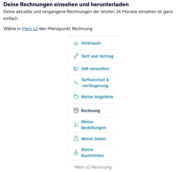 Wenn ich dann stattdessen richtig auf “Mein O2” klicke, kommt lediglich folgendes Menü, bei dem von Rechnungen wieder keine Rede ist.