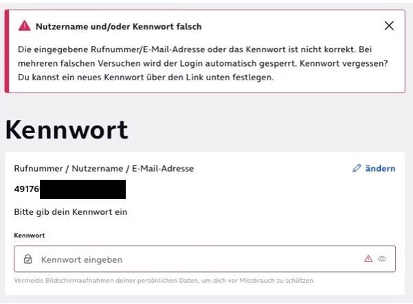 Ich habe jetzt Mobilfunknummer + (gleiches) Passwort probiert: Fehler, ich meine “falsches Kennwort”