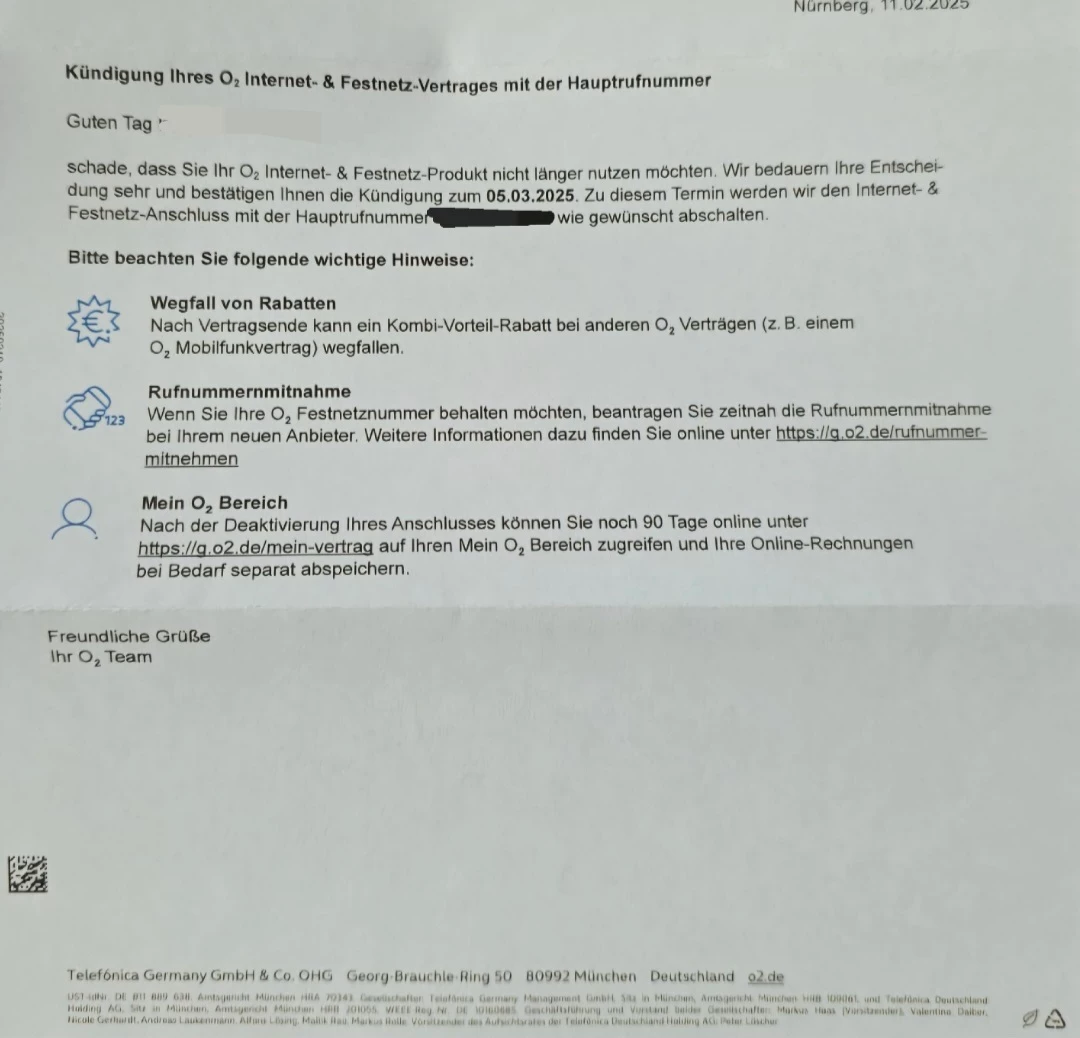 Wie ich schon erwähnt habe, habe ich am 04.02.2025 zum 05.03.2025 gekündigt. Kündigungsdatum wurde auch von O2 schriftlich bestätigt, aber die Rechnungen kommen trotzdem.