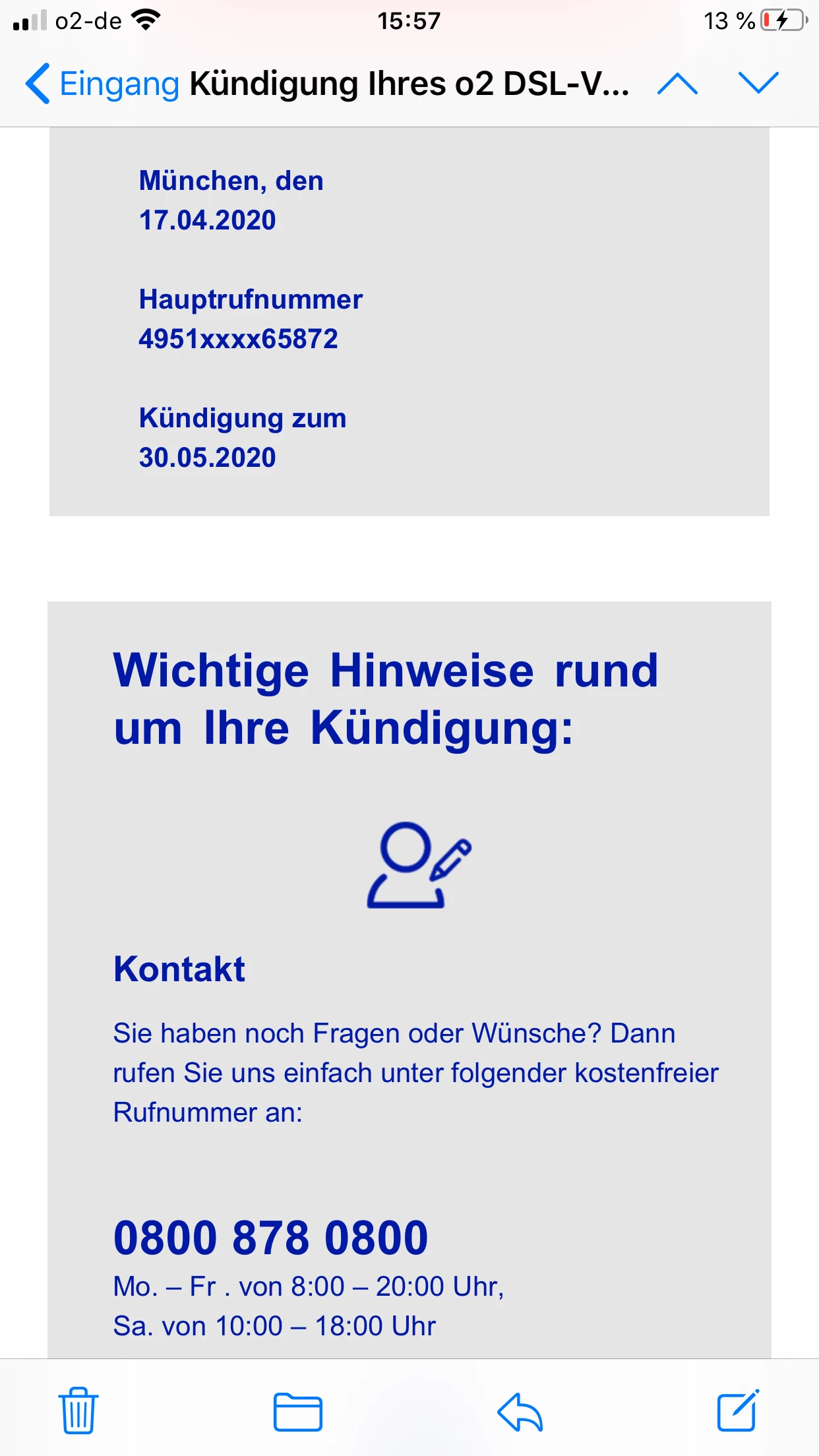Am 20.5. erhielten wir allerdings von deinem neuen Anbieter den Storno des Wechsels, sodass dein Anschluss weiter aktiv geblieben ist. Wir haben dir nun die Deaktivierung des Anschlusses zum nächstmöglichen Termin, den 13.7.2020, hinterlegt.