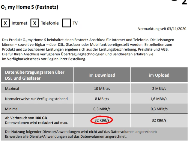 Laut Produktinformationsblatt erfolgt beim aktuellen o2 my Home S die Drosselung auf max. 32 kbit/s. Das Internet ist nach dem Verbrauch von 100 GB im Abrechnungsmonat (kombinierter Down- und Upstream inkl. Telefonie) also praktisch gar nicht mehr nutzbar.
