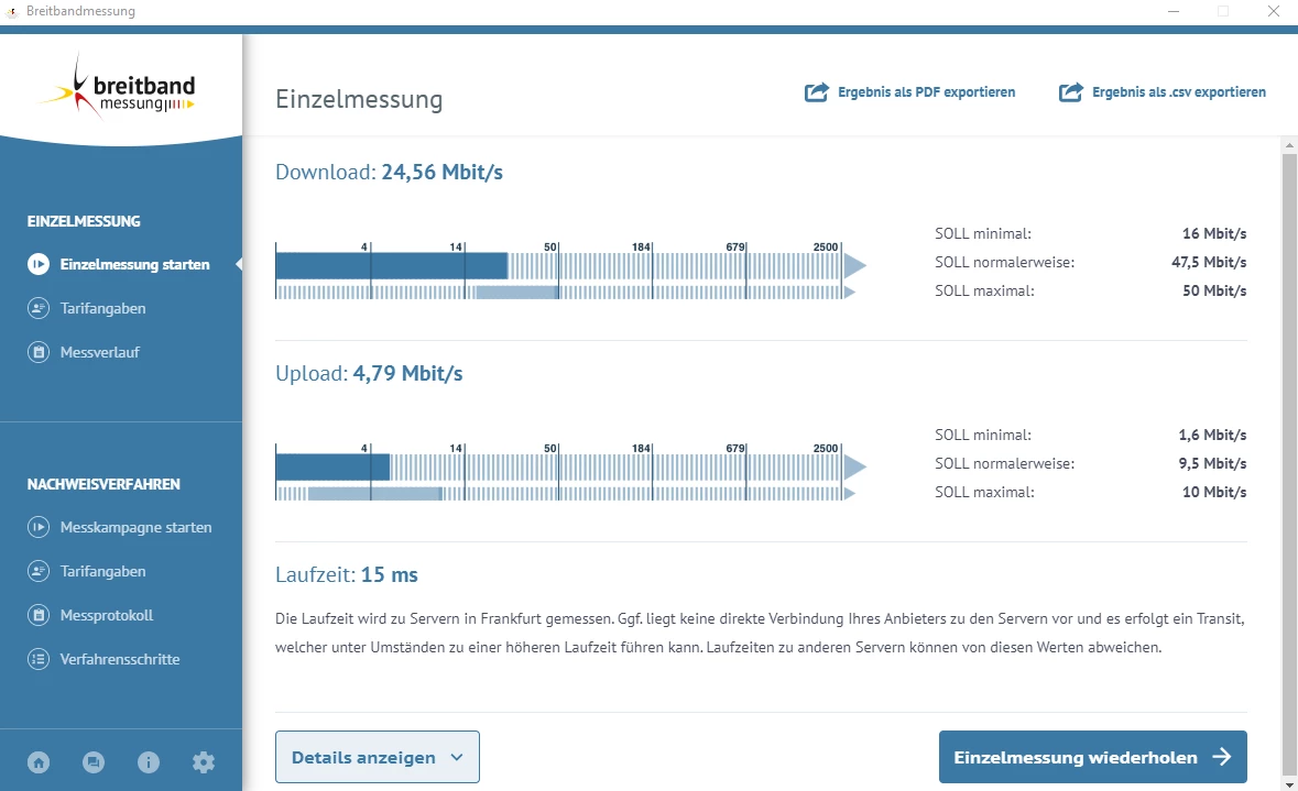 Ich habe schon öfter verschiedener Testprogramme zu verschieden Tageszeiten und an verschiedenen Tagen getestet. Bin aber immer wieder zu identischen Ergebnisse gekommen, sowohl per LAN (Kabellänge ca. 1m vom Router) als auch im WLan. Es kam immer zu ähnlichen Ergebnissen ca. 25/5 Mbit. siehe Messung von gestern: