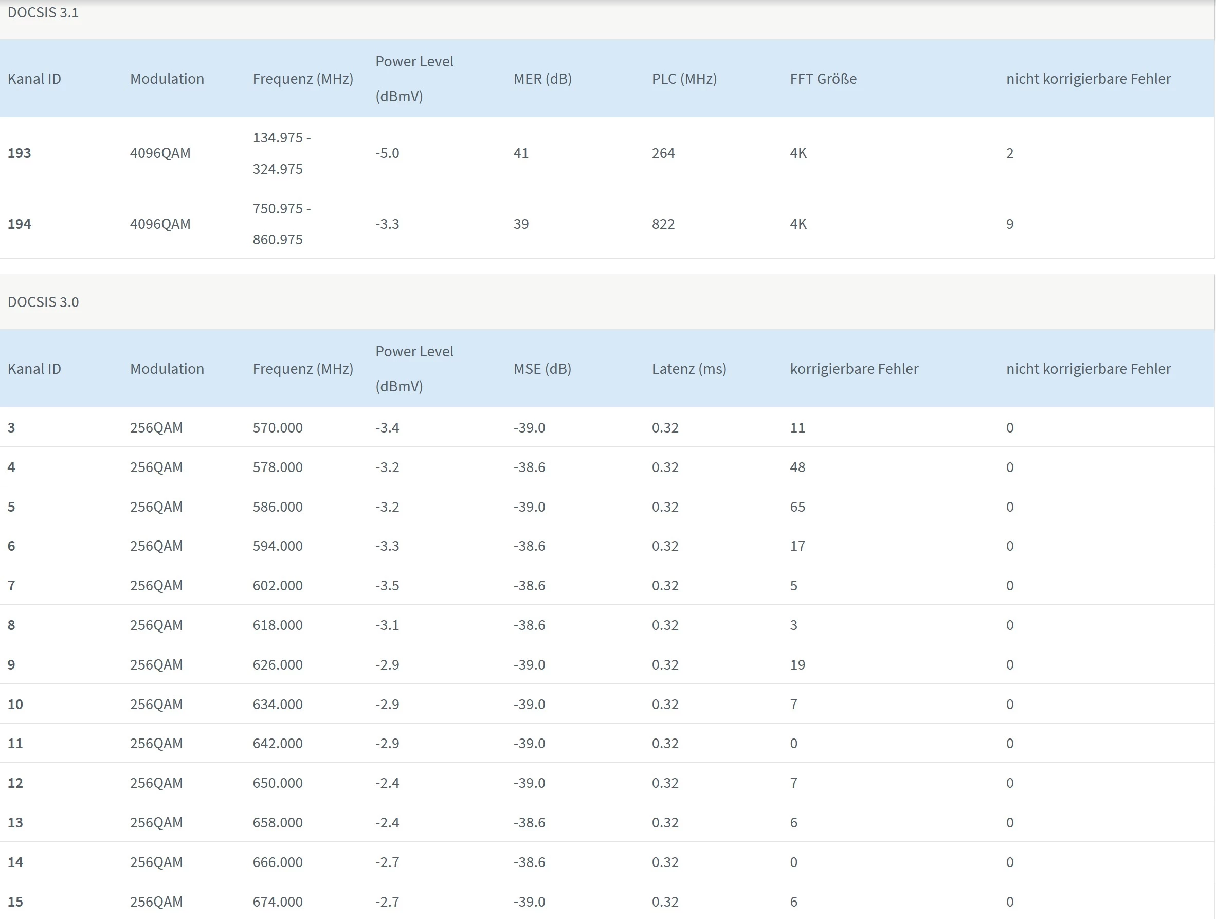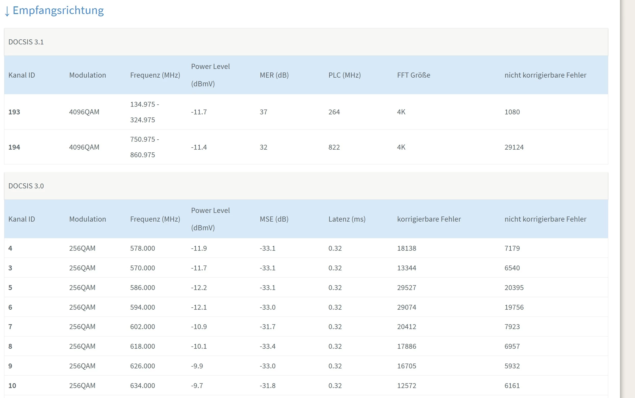 Der Techniker war jetzt mit leichter Verspätung vor Ort, hat die Leitung geprüft und auch nochmal im Keller den Verteiler nachjustiert. Abgesehen von einigen minimalen Problemen konnte er jedoch keinen Fehler feststellen, der die Millionen Fehler pro Leitung und die wegbrechenden DOCSIS 3.1 Kanäle erklären würde.