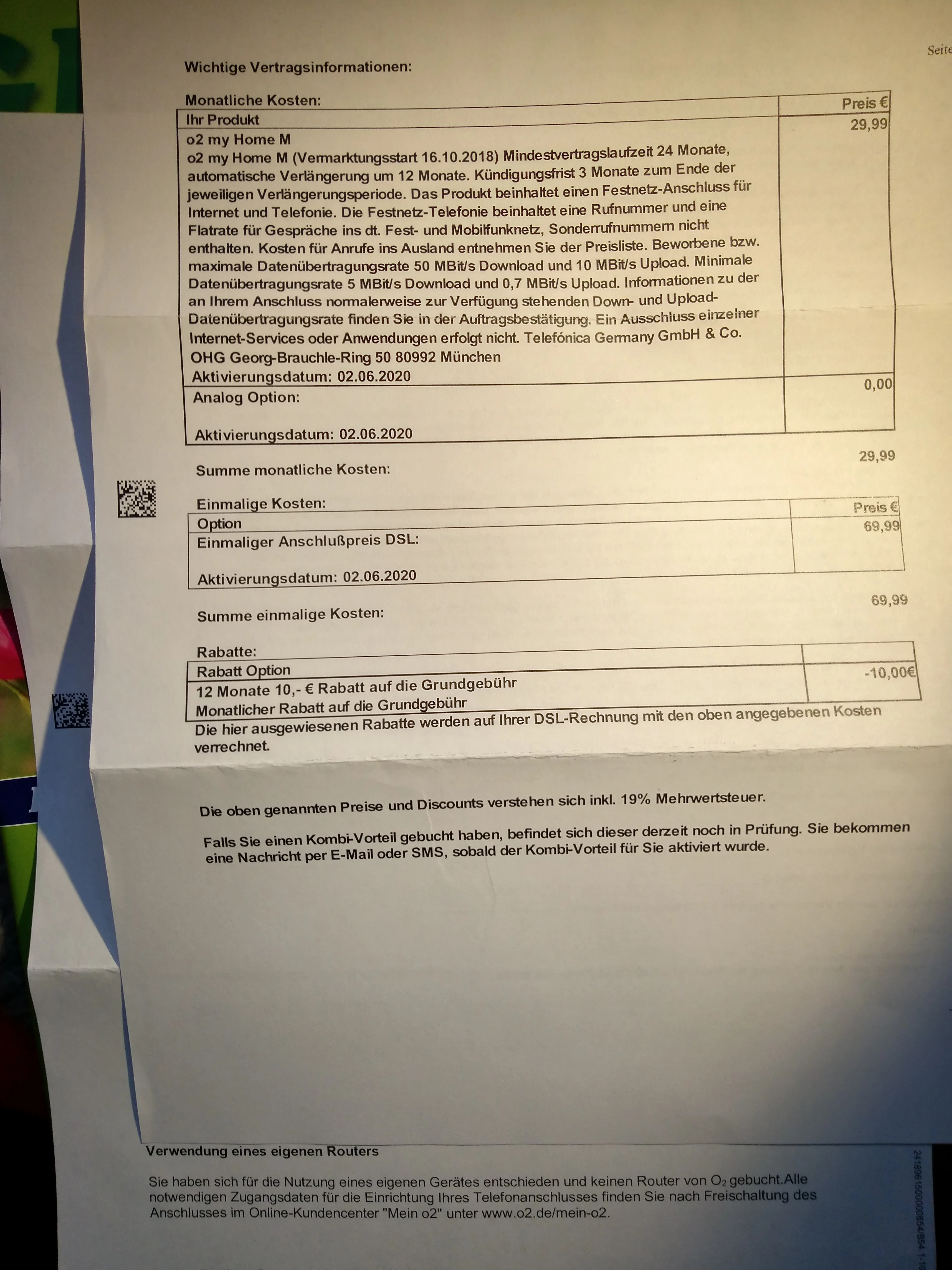 Ich wollte nach etlichen Jahren bei einem Mitbewerber mit meinem DSL-Anschluss zum 02.06.20 zu o2 wechseln (my Home M) . Gesagt, getan, ich habe also am vergangenen Wochenende (25.04) bei der Hotline angerufen, um dies zu bewerkstelligen. Ich sagte im Gespräch mit dem 02-Mitarbveiter unter anderem ausdrücklich, dass ich einen Router (homebox 2) benötige, da ich keinen eigenen besitze. Als die Bestellung aufgenommen war und ich in der Bestätigungsmail den Link für den Bearbeitungsstatus öffnete, war dort jedoch vermerkt, dass keine Hardware bestellt worden sei. Ich rief daraufhin bei der Hotline an, um dies korrigieren zu lassen. Die Kollegin sagte mir nach langen Versuchen und Rücksprachen mit weiteren Kollegen, das sei jetzt "ein echtes Problem" und der Router könne nicht nachträglich der Bestellung hinzugefügt werden, und wenn ich diesen im Nachhinein bestelle, koste das noch einmal 50 Euro Bereitstellungsgebühr, was ich natürlich nicht einsah, denn diese entfällt bei Laufzeitverträgen normalerweise. Sie könne mir aber anbieten, die Bestellung ganz zu stornieren (dies müsse allerdings später ein Kollege aus der "Stornoabteilung" vornehmen) und neu aufzunehmen. Ich willigte ein, und freute mich sehr darüber, dass mir nach dem ganzen hin und her nun auch die Anschlusskosten von 69,99 Euro erlassen werden sollten, was auch aus der dann eintreffenden Bestätigungsmail klar hervorgeht - siehe Anhang. Hier war nun auch der Router vermerkt, also alles korrekt.