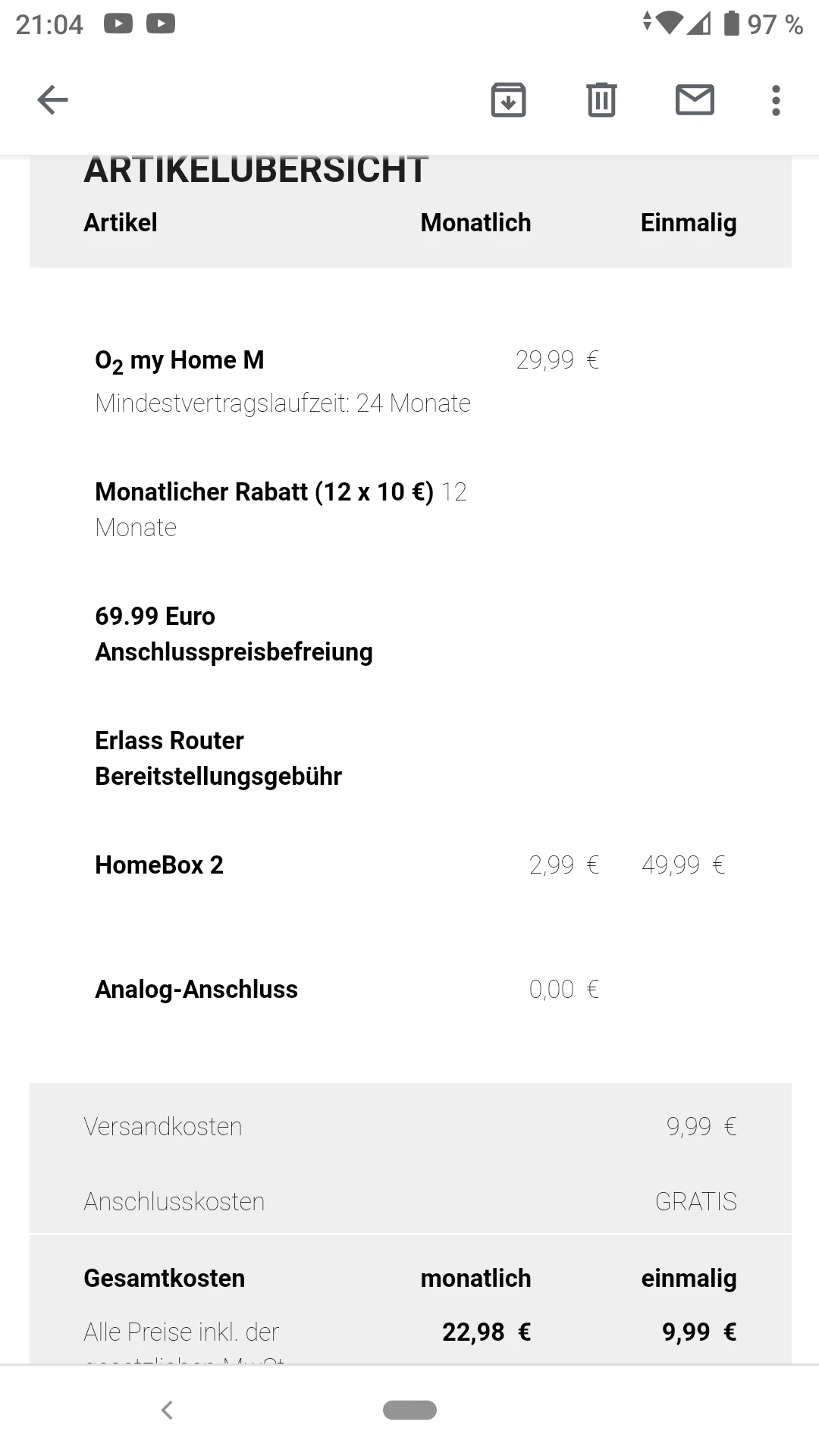 Ich habe ja geschrieben, dass in dem gedruckten Brief, den ich gestern mit der Post erhalten habe, die Anschlusskosten plötzlich wieder aufgelistet sind, die doch laut der Email, wie du oben siehst, entfallen sollten.