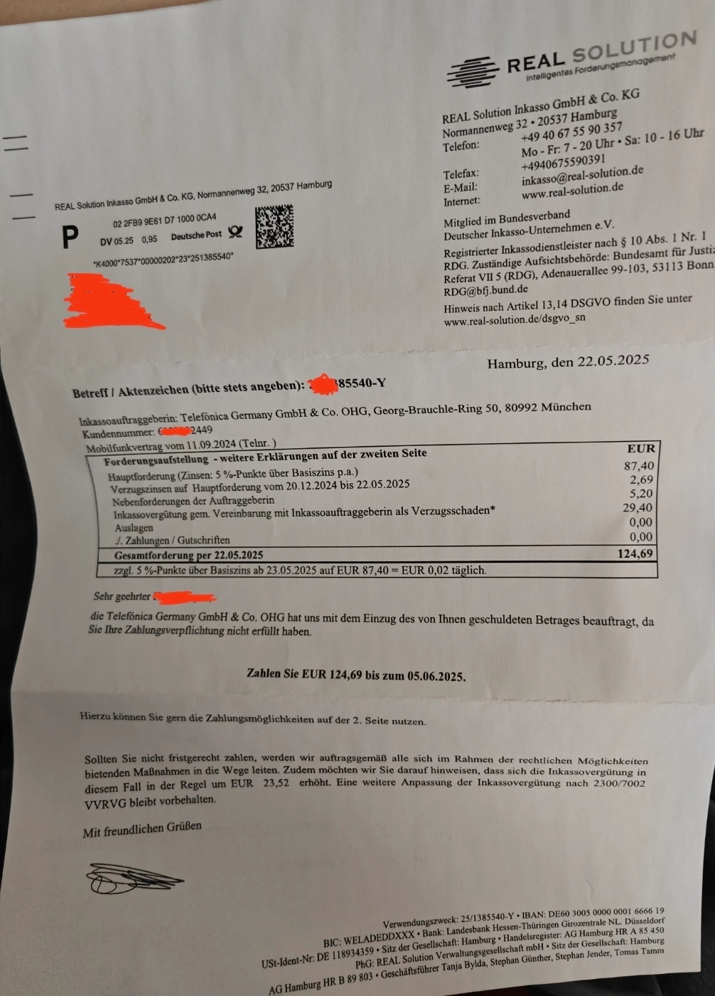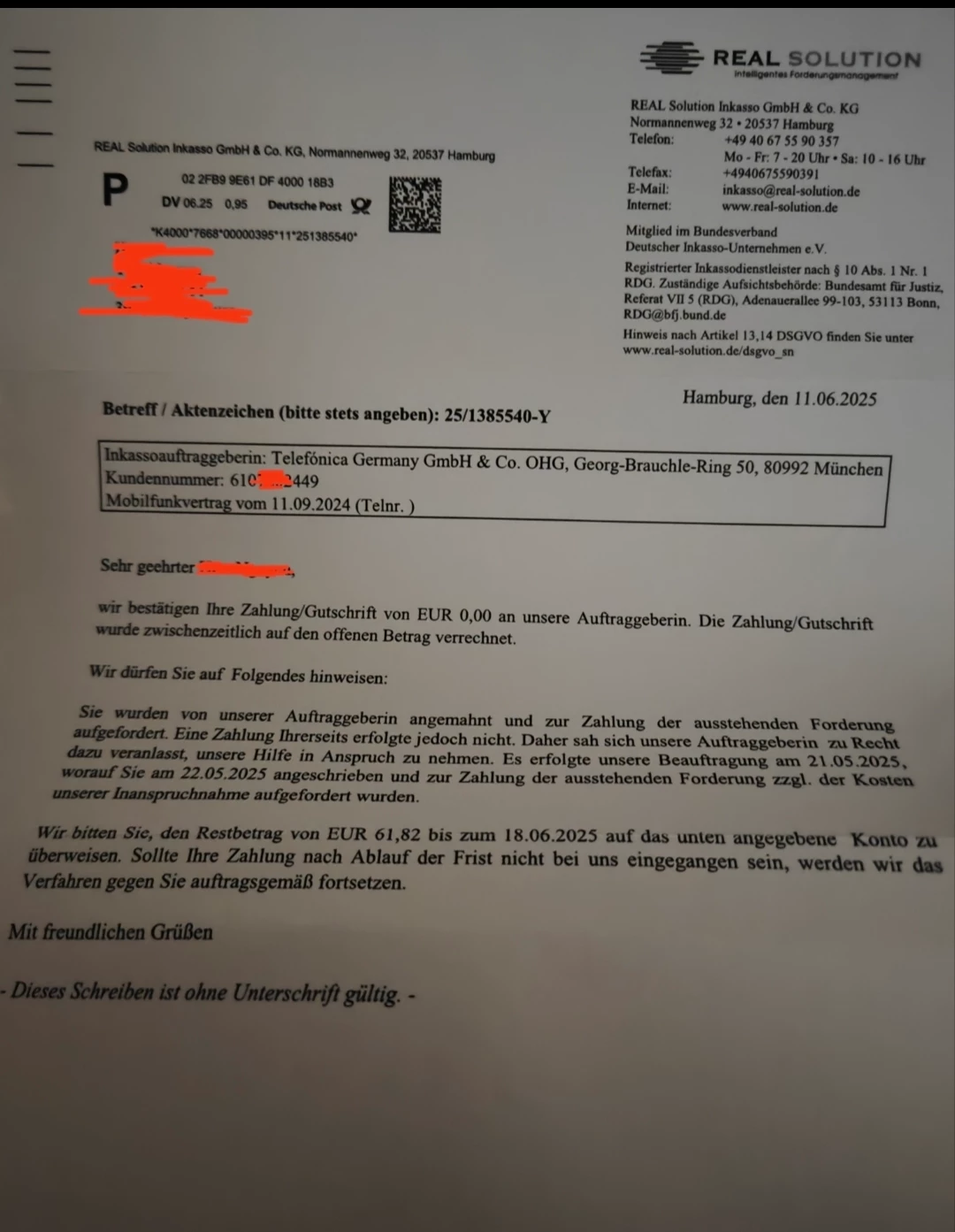 Stattdessen erhalte ich erst heute am 25.06.2025 nun Inkassoschreiben aus Hamburg, Real Solution Inkasso GmbH & Co. KG Normannenweg 32 20537 Hamburg
