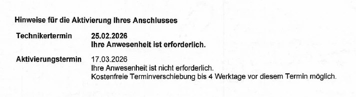 Zum Aktivierungstermin am 17.03.26 muss wohl ein Techniker vorbeikommen, obwohl dieser ja am 25.02.26 schon da gewesen war - wieso kann mir aber keiner sagen. Was der machen soll auch keiner!  Auch nicht warum es in den Brief den ich von O2 bekommen habe ausdrücklich anders drin steht: