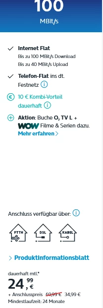 Als Mobilfunkkunde gibt es den “my Home L” (100/40, Flat ins Festnetz, eine Rufnummer) für 24,99€ solange, wie beide Verträge bestehen.