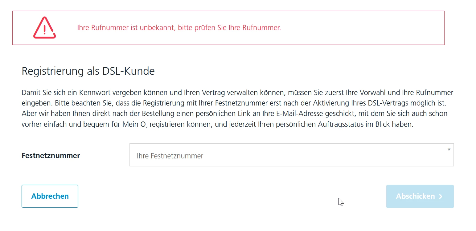 ich habe gestern einen neuen DSL Zugang bestellt mit Anbieterwechsel (von der Telekom). Bis 2018 war ich bereits Kunde bei o2. Der alte Login scheint nun zu verhindern, dass ich mich erneut anmelden kann, um z.B. den Fortschritt meiner neuen Aktivierung einzusehen (s. offensichtliche Fehlermeldung im Screenshot).