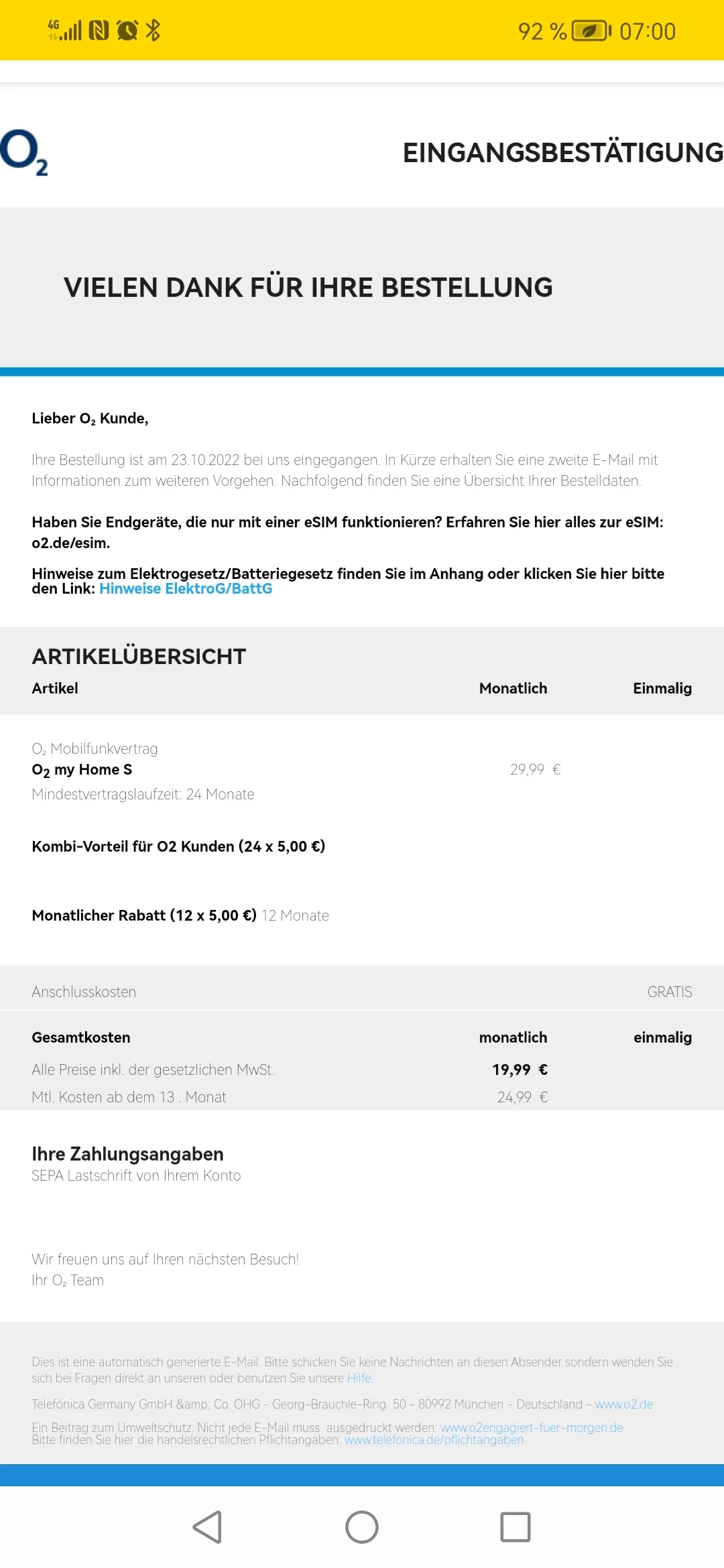 Ich habe etwas bestellt und mir wurde per Email gesagt, dass ich in Kürze eine zweite Mail zum weiteren Vorgehen erhalten werden würde, jedoch habe ich diese Mail nach mehr als 10 Stunden immer noch nicht bekommen.