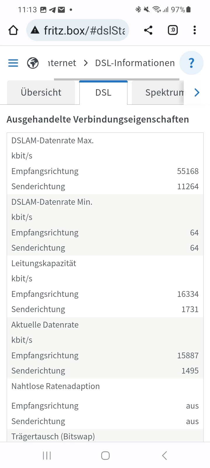 Zudem poste bitte die gesamte Tabelle unter “DSL”, ggf. mehrere Screenshots verwenden. Ich gehe davon aus, dass dein Port ohne Vectoring läuft.