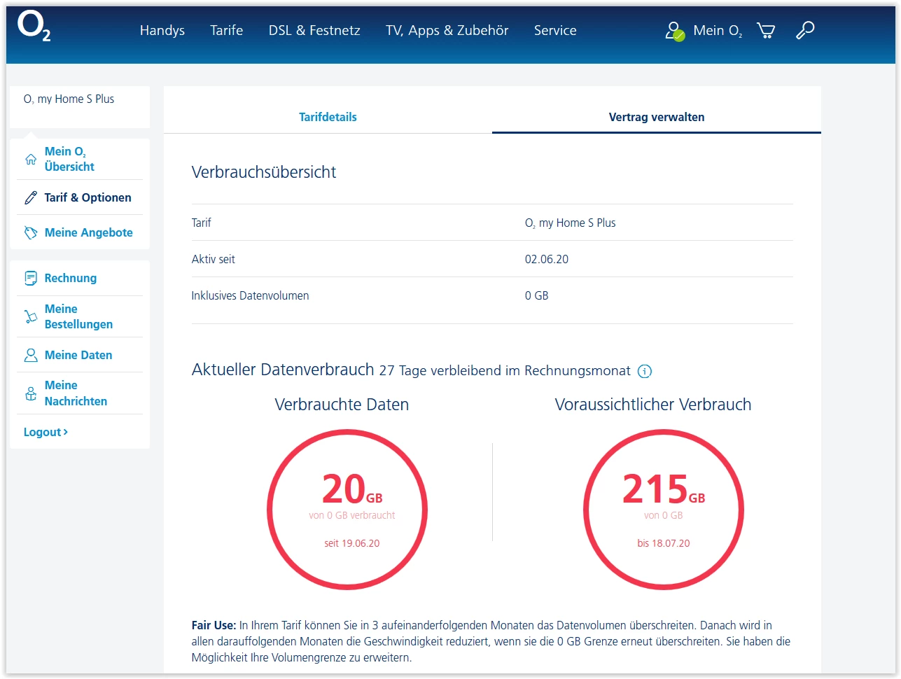 Datenvolumen auf Null, aber Vertrag mit 300 GB