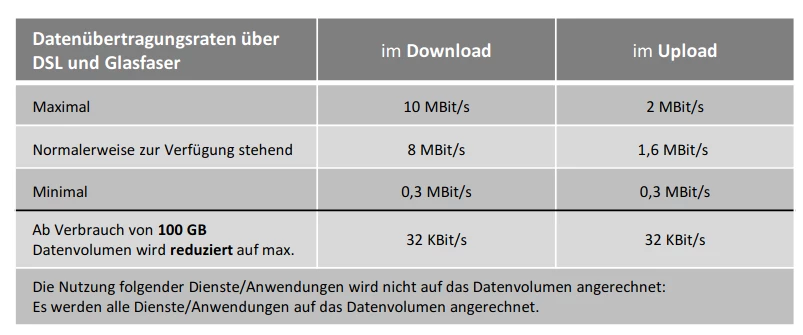 Hier noch mal der Hinweis, dass der o2 My Home S 100 GB inkludiert und nach Verbrauch der 100 GB auf 2MBit/s bis zum Rechnungslaufende limitiert ist.