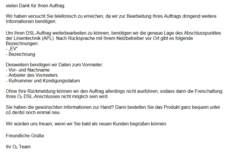 vor zwei Wochen habe ich eine Bestellung für einen DSL Anschluss für meine neue Wohnung gemacht. Nun habe ich eine Email bekommen das noch Daten des Vormieters und über den APL fehlen und das ohne Rückmeldung der Auftrag nicht ausgeführt werden kann.