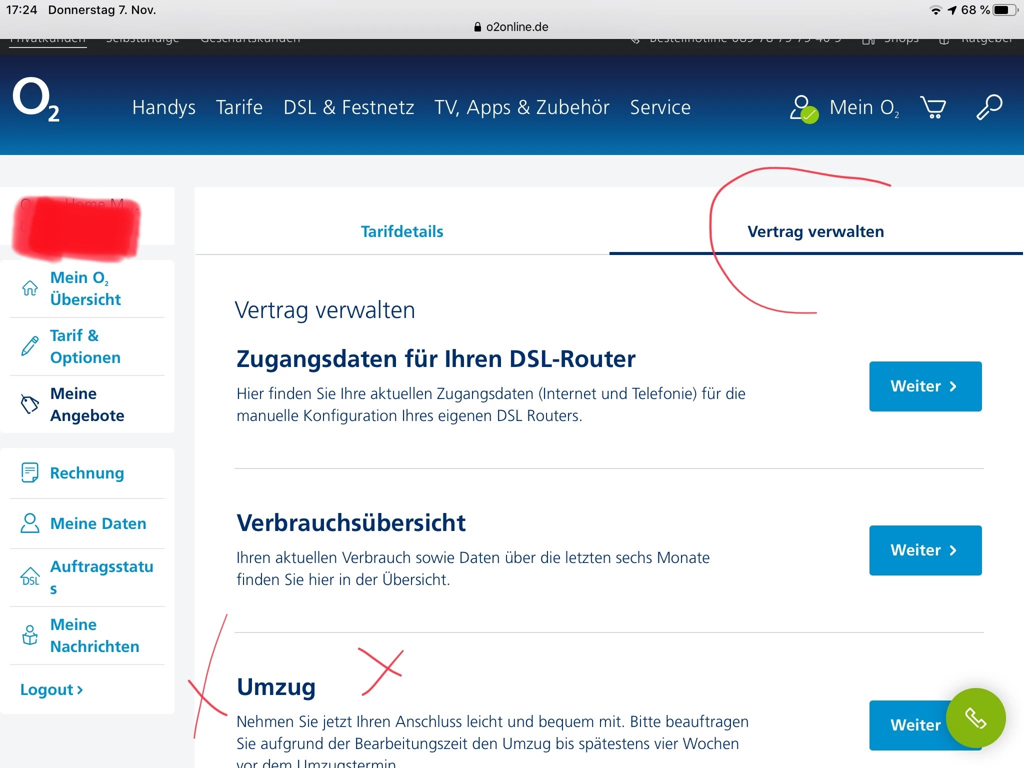 Under change of ownership there is link to Mein o2 and it takes to the O2 overview page. Further there are no steps or procedure mentioned for DSL contract transfer.