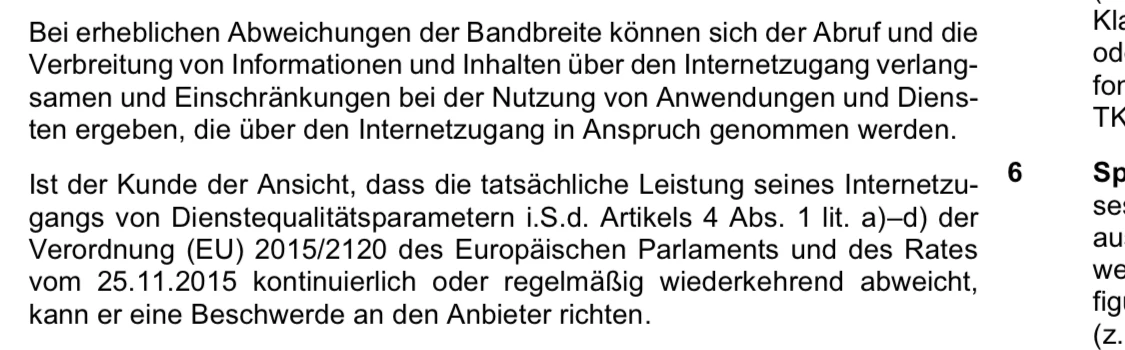 Laut EU Verordnung des EU Parlaments 2015/2120 Artikel 4 Absatz 4 mit einer Konkretisierungsmitteilung der Bundesnetzagentur 485/2017, Amtsblatt Nr. 13/2017 liegt eine dauerhafte Abweichung dann vor, wenn nicht einmal in 20 Messungen, an 2 Tagen mindestens 1x 90% der „vertraglich!“ vereinbarten Maximalgeschwindigkeit erreicht wird.