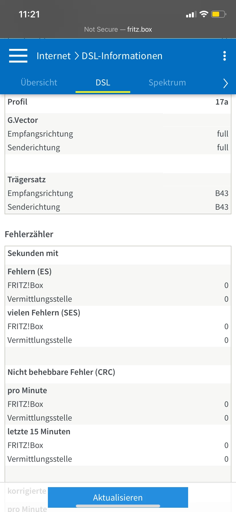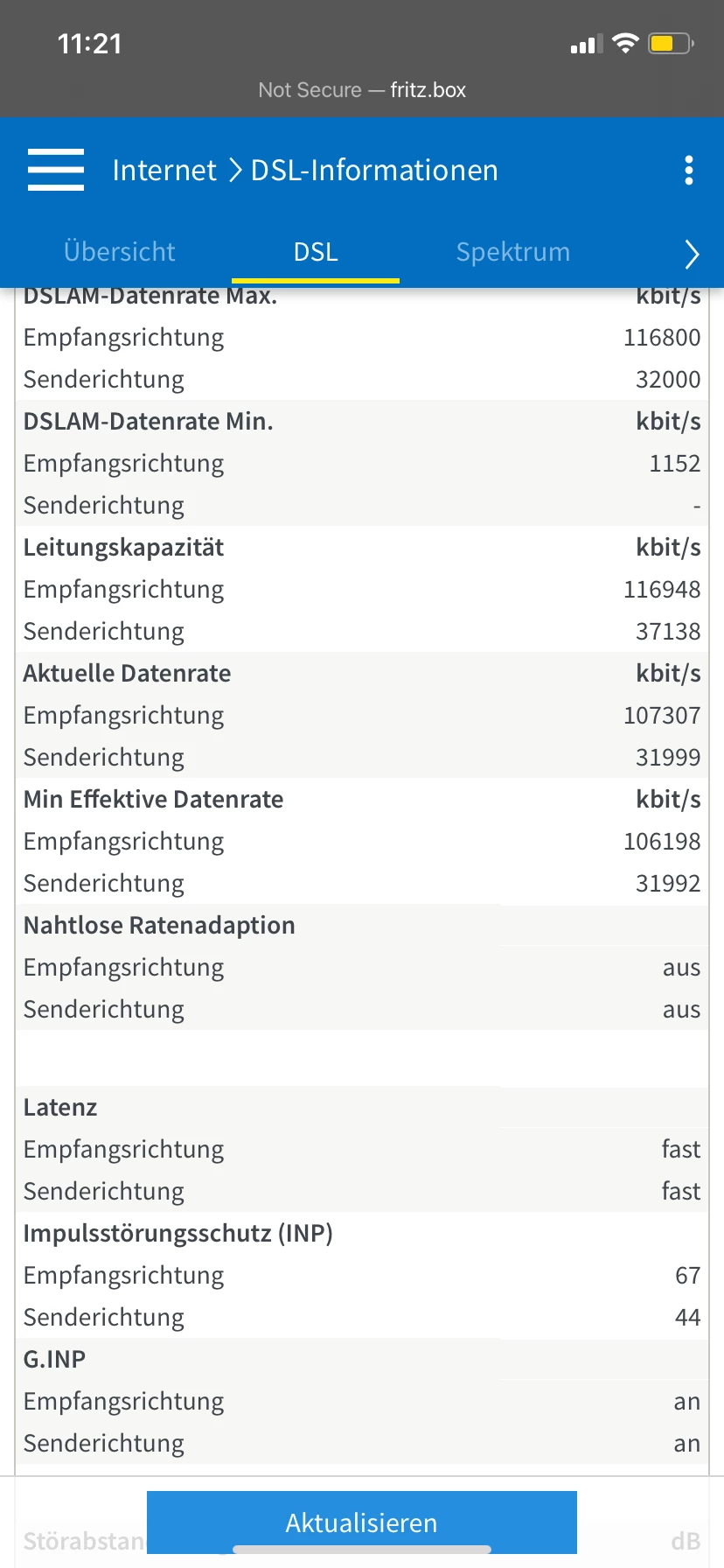 An der Leitung selbst ist nichts bezüglich Abbrüchen oder einer verringerten Bandbreite zu erkennen, weswegen auch meine Kollegen keine weitere Entstörung vornehmen konnten und auf örtliche Gegebenheiten/Einstellungen des Routers hinwiesen.