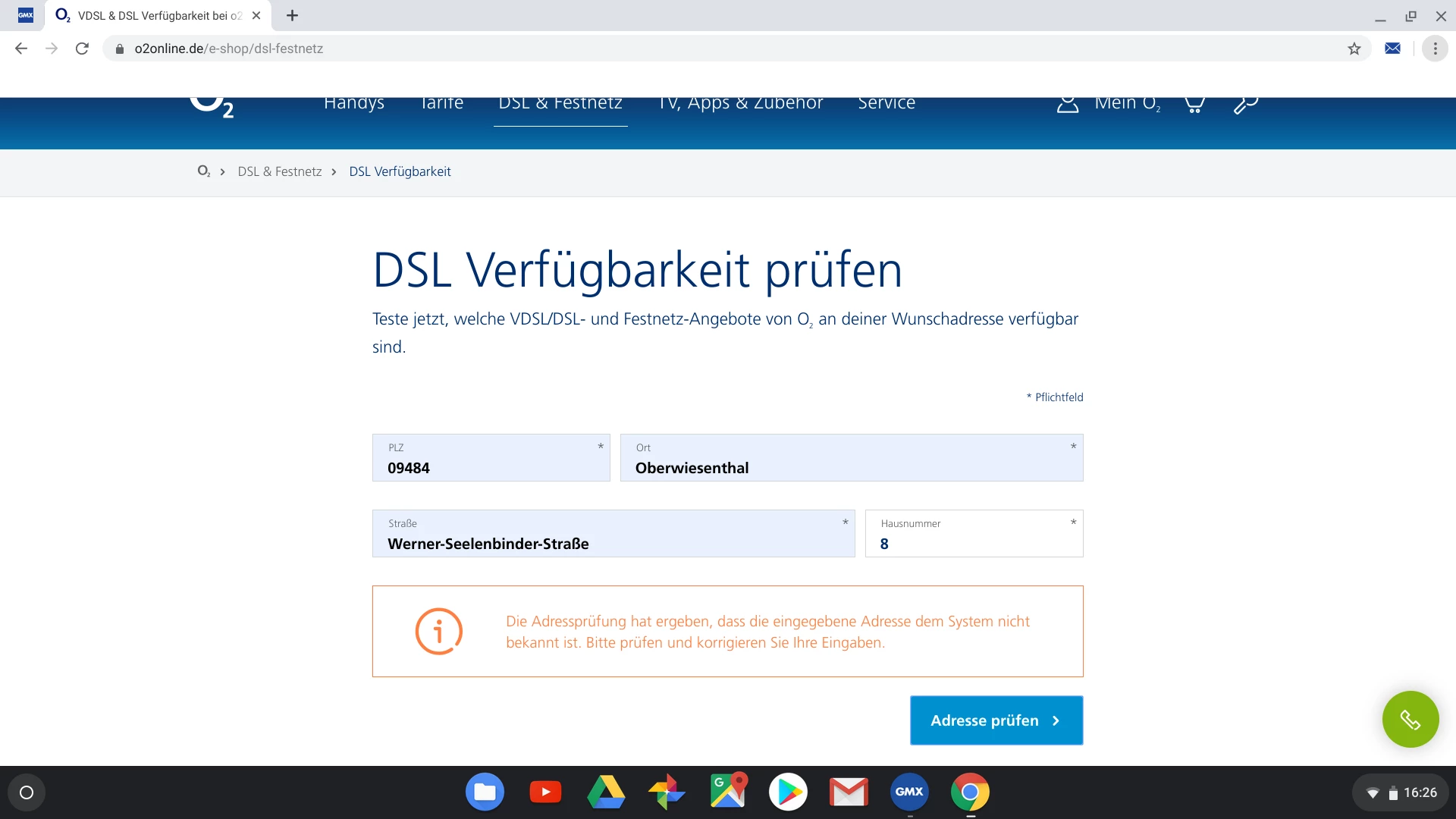 Also ich kann nicht erkennen das der Tarif verfügbar sein soll [color=blue] Link entfernt [/color], von wann ist denn dein Test ? Ich habe extra nachgeschaut für dich, falls du etwas übersehen haben solltest. Wenn die O₂  Adressprüfung ergeben hat, dass die eingegebene Adresse dem System nicht bekannt ist, kann es sein das die Daten falsch eingegeben wurden oder der Vorleister nüscht vermietet. Hattest du denn deine Daten richtig geschrieben?
