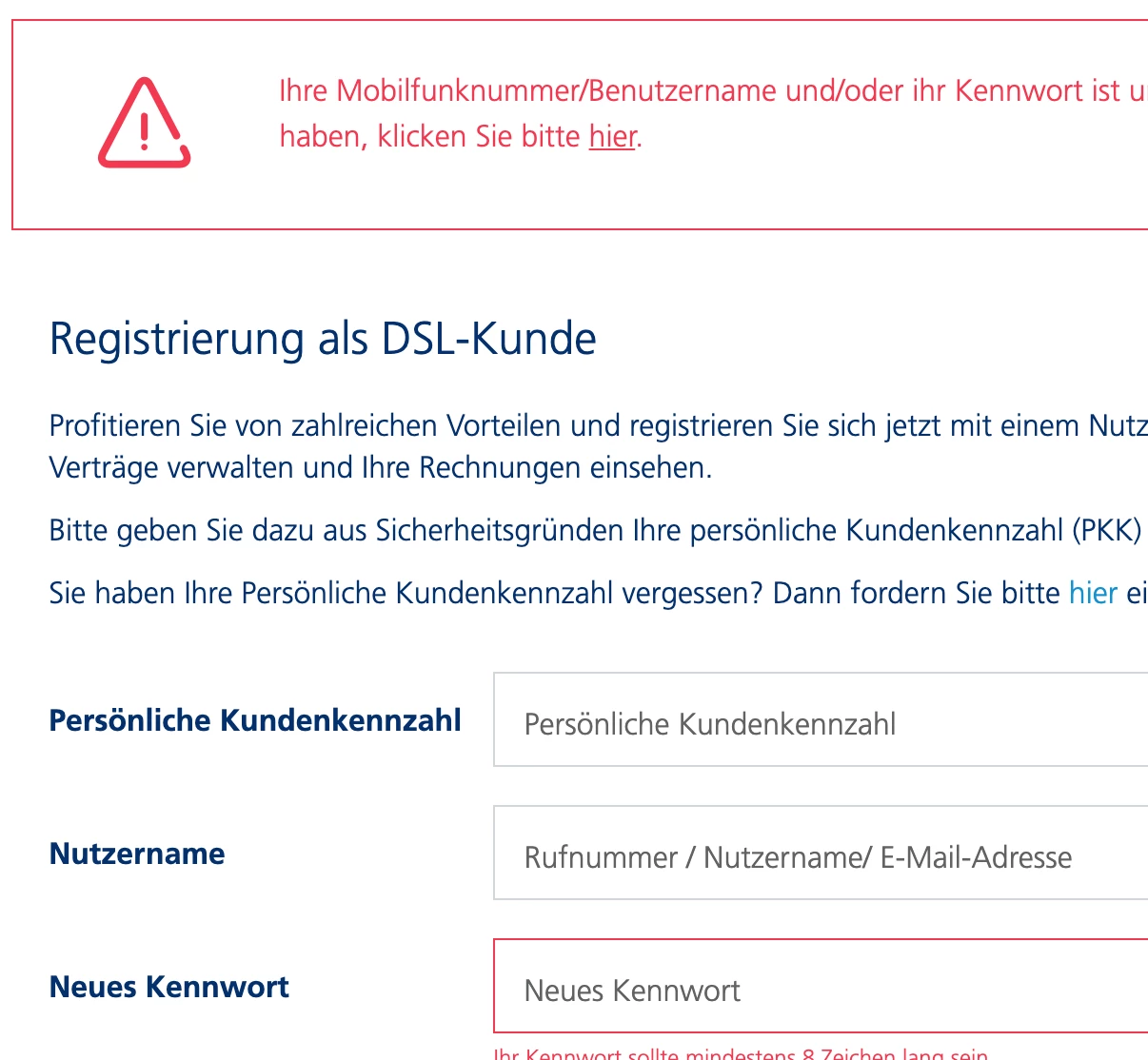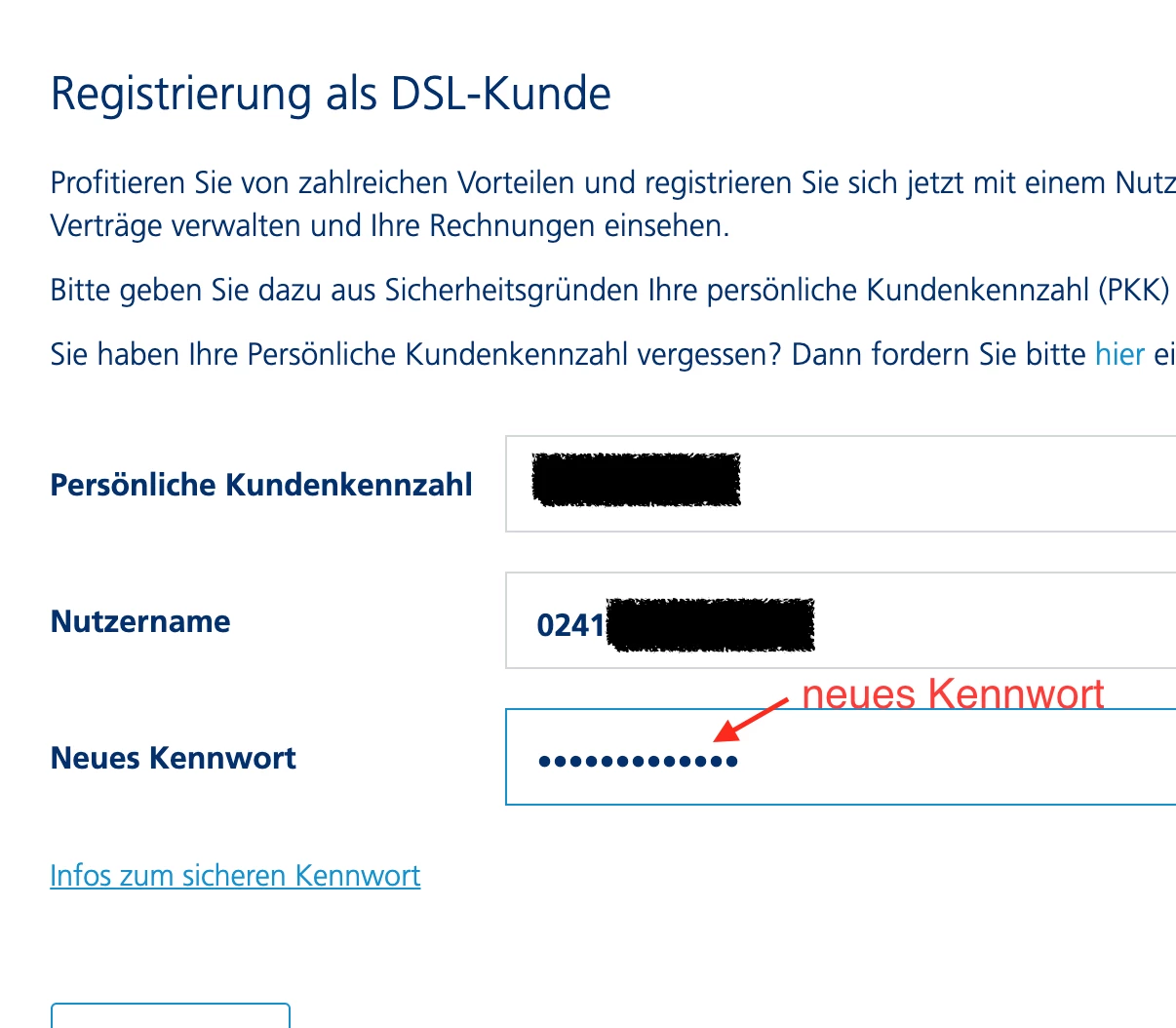 Also: da der DSL Vertrag auf einer eigenständigen Kundennummer läuft, muß eine komplett neue Registrierung erfolgen. Als erstes benötigst du die Persönliche Kundenkennzahl, die beim DSL von der bei Mobilfunk hinterlegten abweicht. Wenn gewünscht, kann ich den erneuten Versand per Post veranlassen. Ist diese vierstellige Kennzahl bekannt, kann es weitergehen gemäß der Richtlinien zur Vergabe des Nutzernamens und des Kennwortes. Wichtig ist vielleicht auch noch zu wissen: