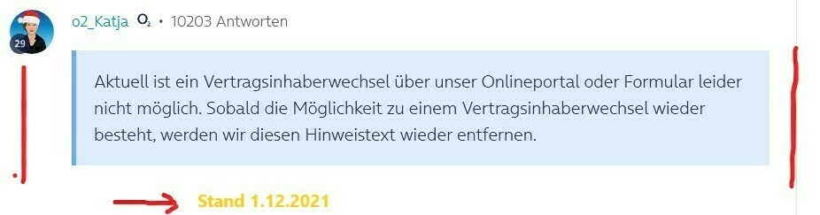 Und ich frage hier einfach noch mal, weil ich zwar kein Informatiker bin, aber dennoch täglich mit PC und Software umgehen muss: wo ist das Problem, aus dem Namen Müller den Namen Schmidt zu machen und noch fix dessen IBAN Nummer zu ändern? Denn mehr ist ein Vertragsinhaberwechsel nicht. Und hier liegt der Hase im Pfeffer: o2 könnte das Problem doch einfach kurz erklären, oder nicht?
