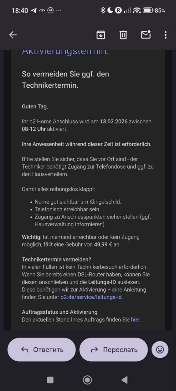 Alles wurde bestätigt, und mir wurde gesagt, dass der Anschluss am 13.03 aktiviert wird.