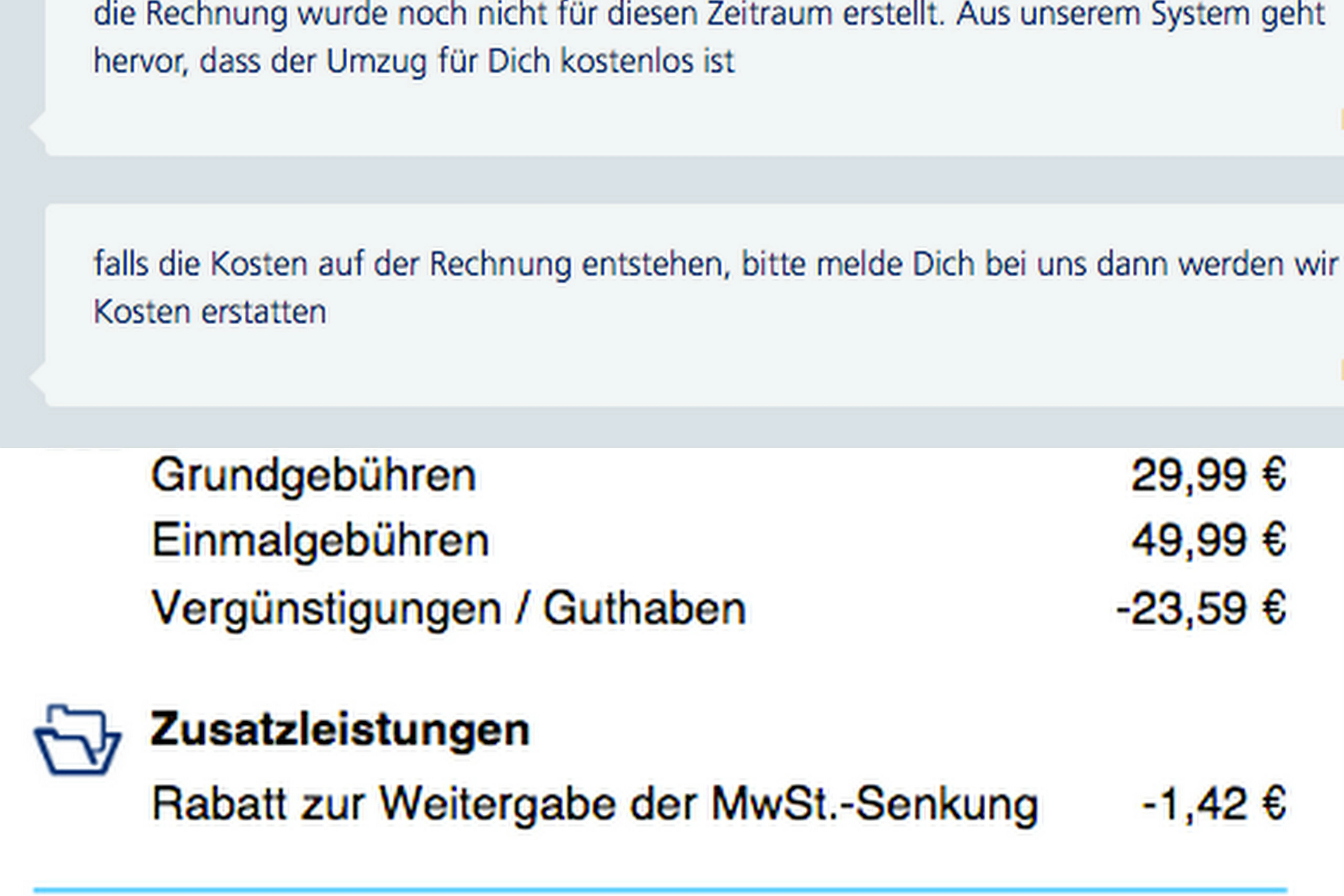 Ich habe mir den Fall angeschaut und dir die Gebühren für den Umzug gutgeschrieben. Das Guthaben wird automatisch mit der/den nächsten Rechnung/en verrechnet und unter “Beträge aus dem Vormonat” aufgeführt.