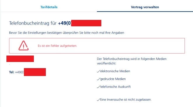 Es ist ein Telefonbucheintrag erwünscht (ohne Adressangaben); wählt man die entsprechenden Optionen (gedruckt & elektronisch) im Onlinekonto und schickt diese ab, erscheint schlicht die Meldung “Es ist ein Fehler aufgetreten” eine Erklärung bleibt das Portal schuldig.