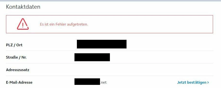 Wenn ich auf meine Daten gehe zu meiner Mailadresse gibt es auch einen “Button” “Jetzt Bestätigen” allerdings kommt dann eine Fehlermeldung wie folgt: