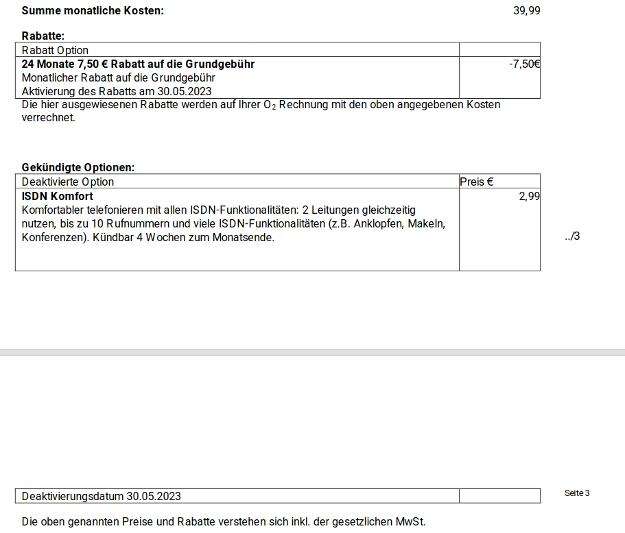 3. Nachdem dieser Auftrag ohne Rückmeldung niemals aktiviert worden war und ich in der Schwebe gelassen wurde, habe ich mich beschwert und eine neue Vertragsbestätigung ohne meine Zustimmung erhalten mit erneuter Verschiebung des Anschlusstermins. Alle Rabatte wurden gestrichen. Nach Beschwerde über Streichung der Rabatte wurde erklärt, alle früheren Verträge seien angeblich früher storniert worden. An mich wurde nichts kommuniziert.